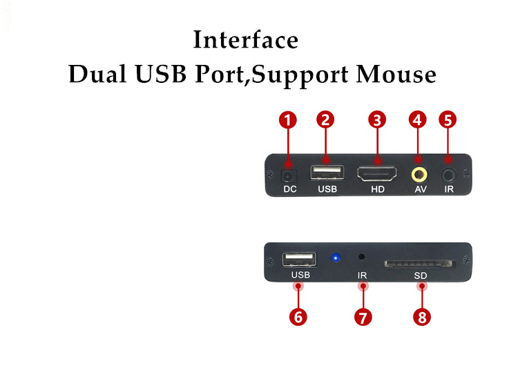 Interface: HDMI2.0, AV, 2xUSB2.0 Host, SD/IR