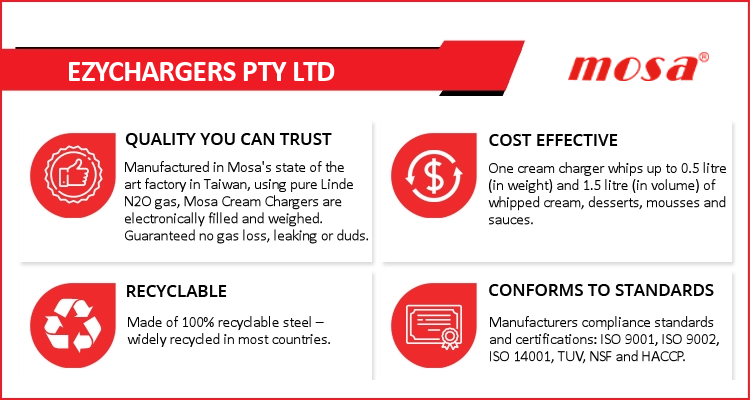 Ezychargers specializes in the import and distribution of small compressed gas products, including Cream Chargers (N2O - Nitrous Oxide), Cream Blenders/Dispensers, Sparkling Water Chargers (CO2 - Carbon Dioxide), Sparkling Water Siphons and other related accessories. Our imported brands Mosa, Liss and Kayser serve thousands of customers every day in numerous restaurants, cafes, coffee shops, ice cream parlors, bakeries, delis, milk bars, hotel stores, home and kitchen stores and many retail outlets Provide services.