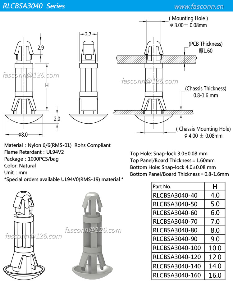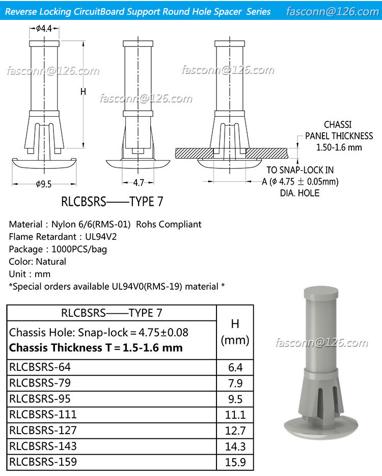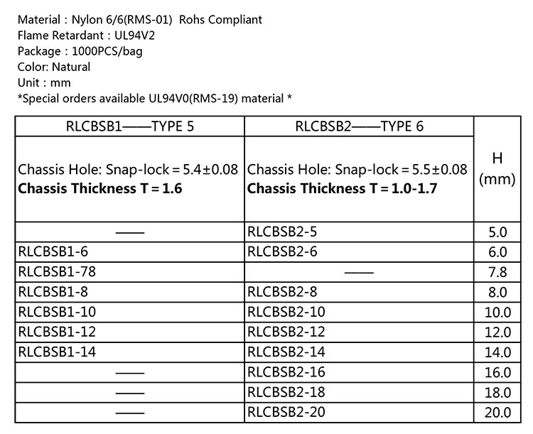* Available in natural UL94 V2 Nylon 6/6 RMS-01 and available in UL94V0, RMS-19 material.