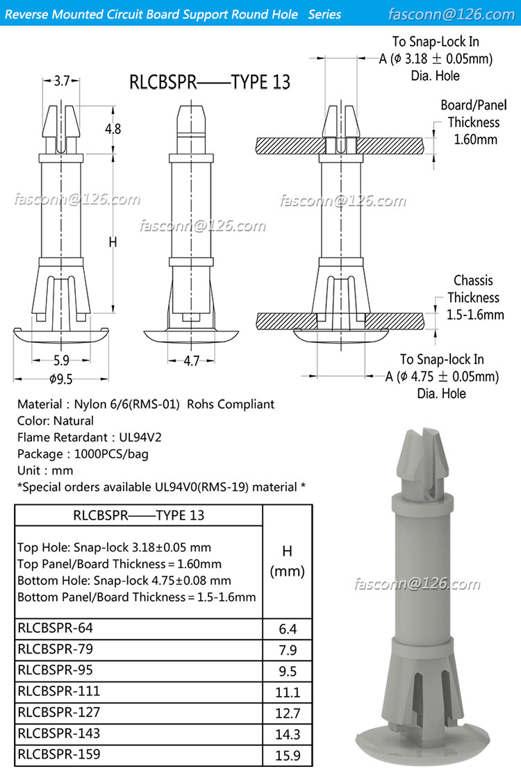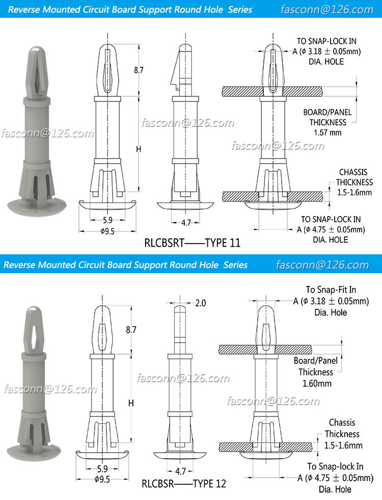 The reverse-mount circuit board support round holes are suitable for heavy-duty circuit boards. It provides minimal protrusion under the board. It inserts from the bottom of the chassis, first the body, then the pins. The two-piece assembly provides a solid component that can withstand high shear loads while still providing an understated finished look on the back of the chassis.