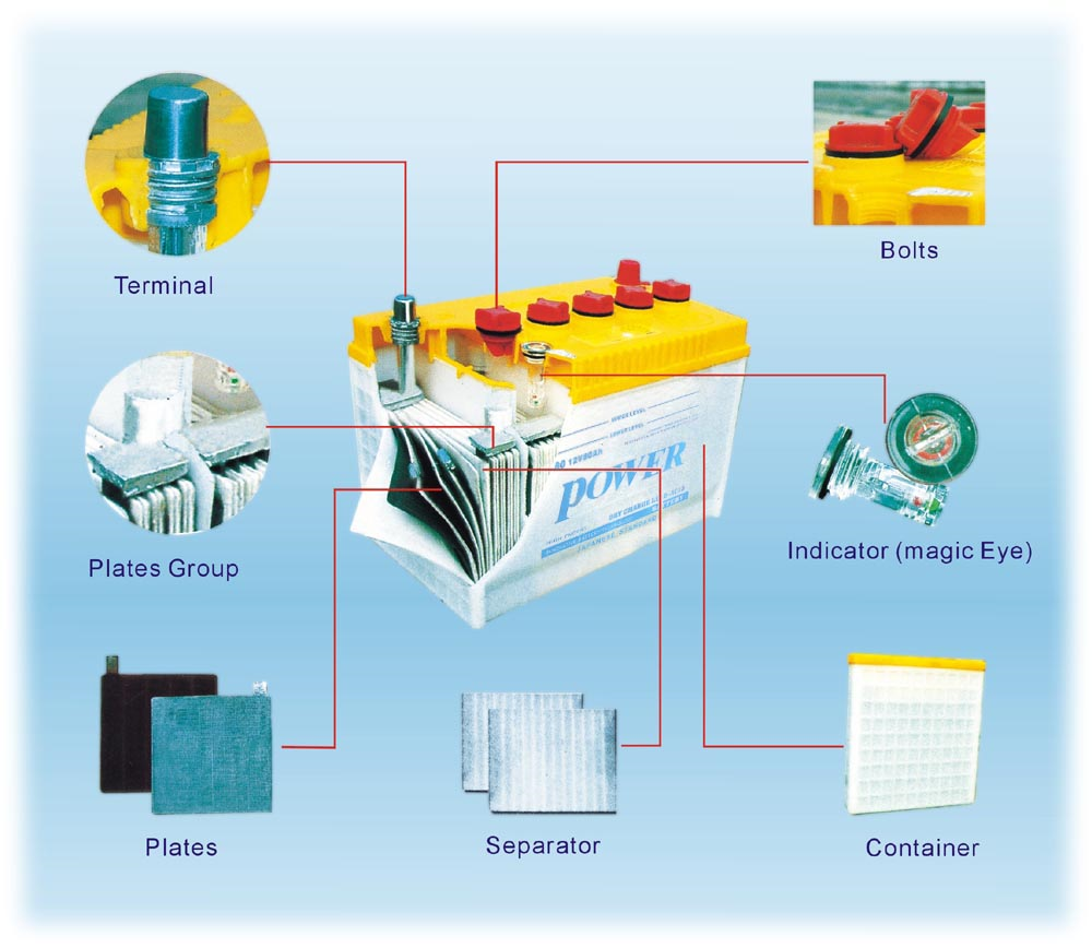 2. Plate material: High-purity lead, lead-calcium alloy, tin alloy for maintenance-free batteries, lead-antimony alloy for dry-charge batteries.