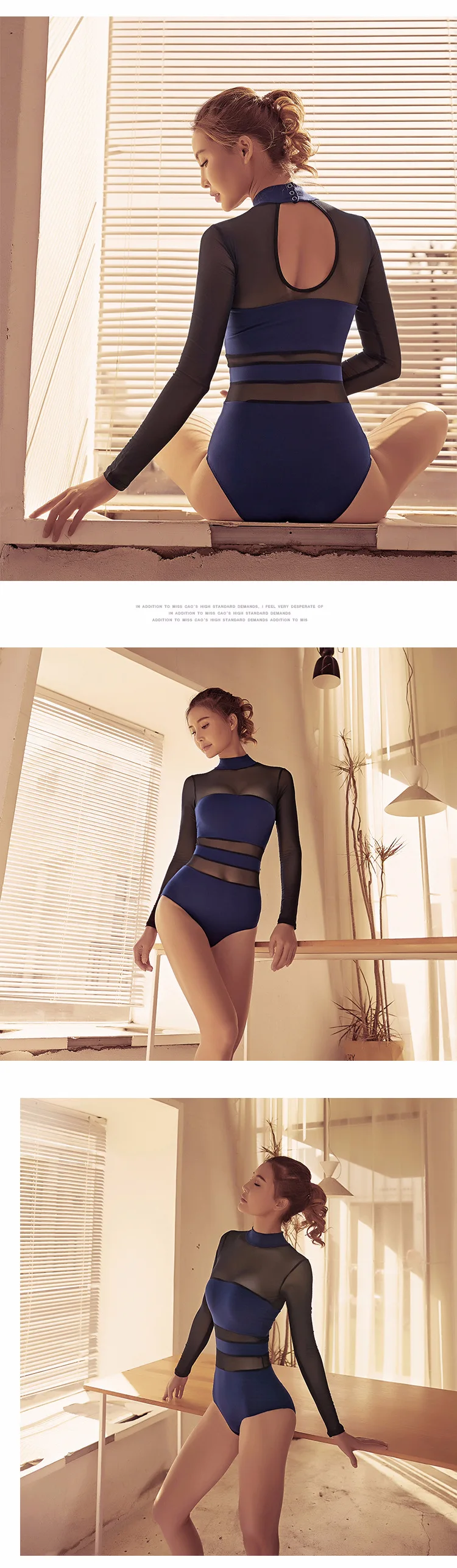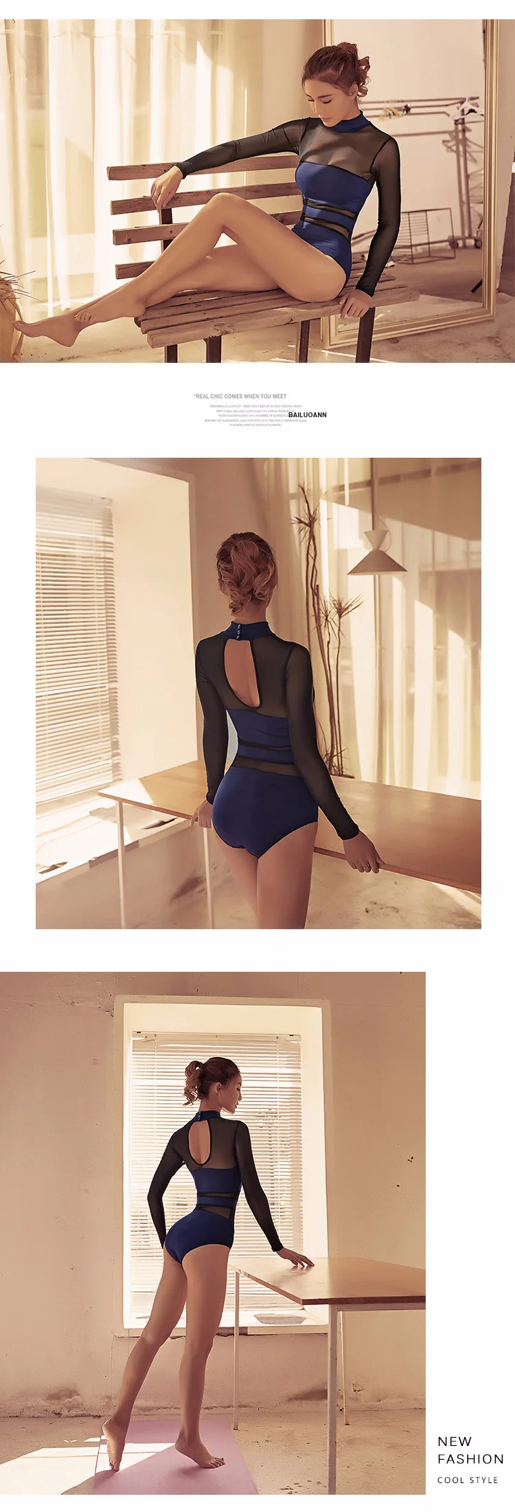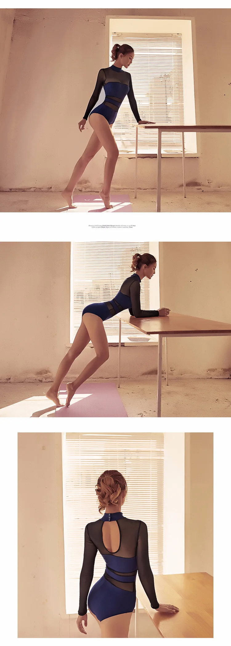 OEM Women Cut out Sheer Mesh Insert Bodysuit Long Sleeve Leotards Girls for Ballet Competition Convention Dance biketard Balera