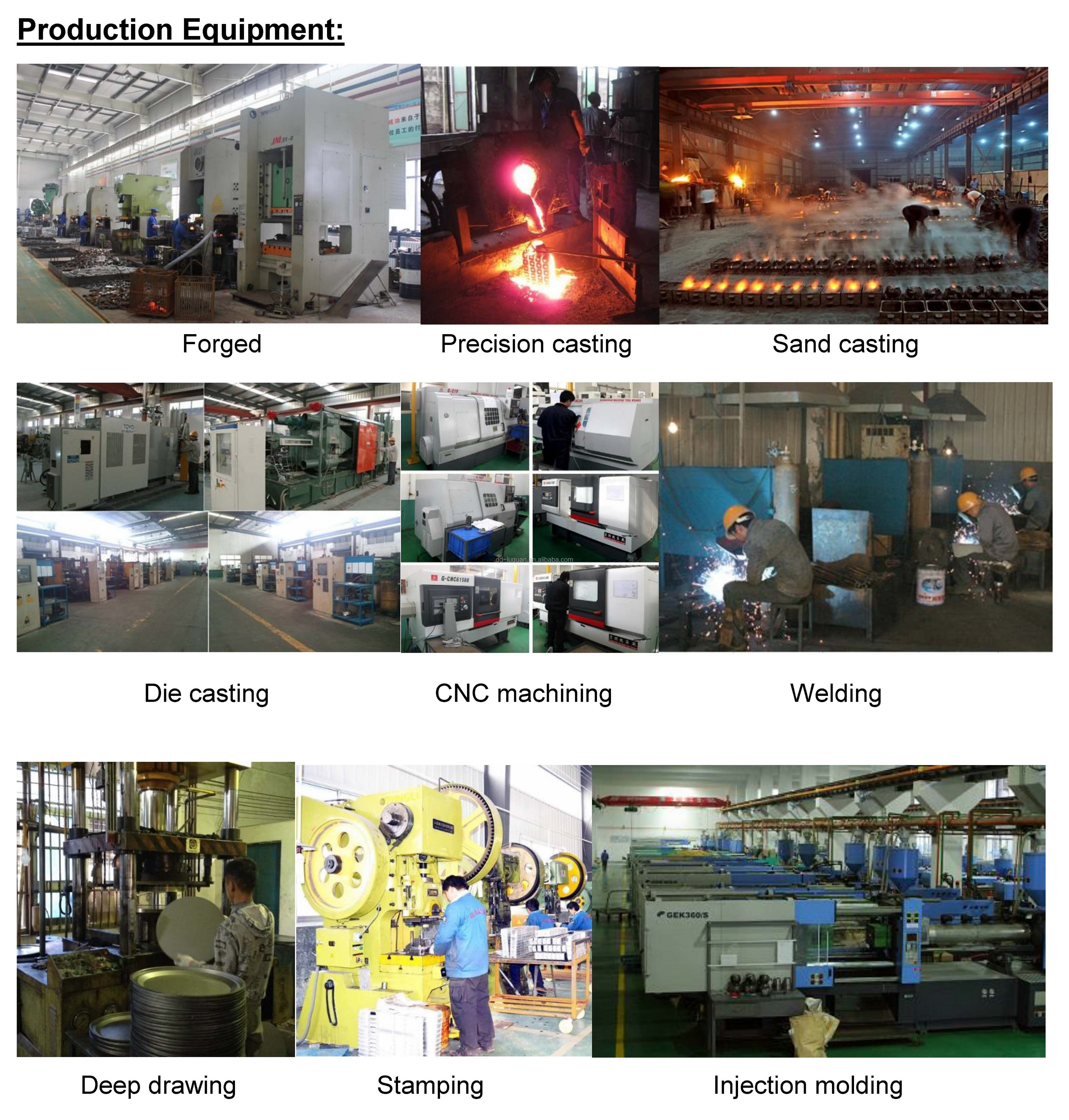 Our production processes are forging (steel, stainless steel, copper, aluminum), precision casting (steel, iron, aluminum, copper), die casting (aluminum, zinc), CNC machining, stamping welding (steel, stainless steel), deep drawing and spinning Pressing (steel, stainless steel, aluminum, copper), wire bending and welding (springs, brackets, etc.), injection molding (PP PE PVC ABS TPU, etc.), polyurethane casting, rubber products, etc.