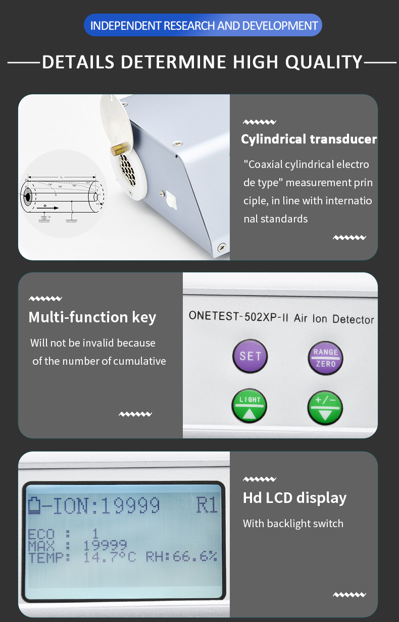 ONETEST-502XP adopts coaxial cylindrical electrode design, which has the advantages of stable sampling airflow, uniform ion distribution measurement, strong anti-interference ability, etc. High concentration of negative ions