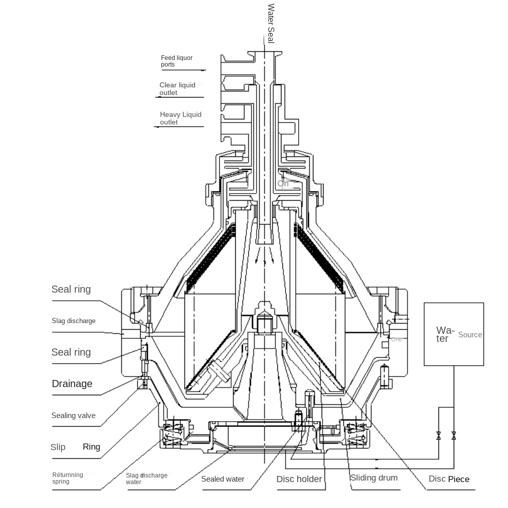 High-speed disc separators are vertical centrifuges. The drum is installed on the upper end of the vertical shaft, and is driven by the motor to rotate at high speed through the transmission device. In the drum, there is a set of disk-like parts - discs - stacked together. There is a small gap between the discs. The suspension is added to the drum from a feed tube located in the center of the drum. As the suspension flows through the gaps between the discs, the solid particles sink to the discs under the action of the centrifuge to form a precipitate. The sediment slides along the surface of the disc, breaks away from the disc, and accumulates in the larger diameter part of the drum. The separated liquid is discharged from the outlet of the drum. The function of the disc is to shorten the settling distance of solid particles and expand the settling area of the drum. Due to the installation of discs in the drum, the production capacity of the separator is greatly increased. After the separator is stopped, the solids accumulated in the drum are removed manually, or discharged from the drum without stopping the slag removal mechanism.