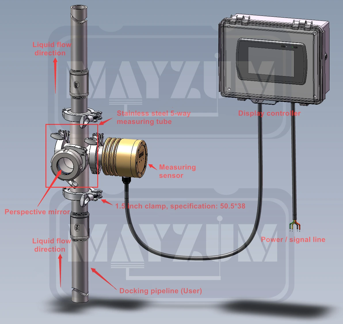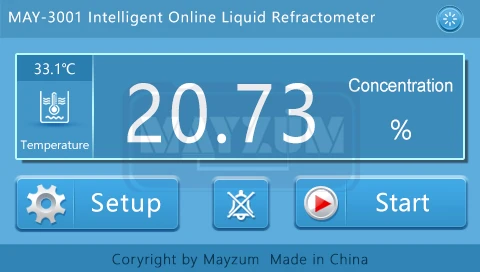 MAYZUM MAY-3001 Online Refractometer adopts the principle of critical angle detection. It can be installed on pipes of different pipe diameters or on the walls of tanks for concentration monitoring and control. It can directly display percentage concentration or user-defined units on site. Display and remotely transmit analog signal (4-20mA) to the recorder for real-time data storage, printing, traceability and other functions; remotely transmit 4-20mA signal to PLC/DCS/frequency converter for monitoring or control. MAYZUM MAY-3001 online concentration meter is not affected by the color, turbidity, bubbles, solid particles and other impurities of the material, and has a high-precision automatic temperature compensation function. The fully shielded anti-jamming design and the direct conversion and processing of photoelectric signals ensure the accuracy of online measurement and prolong the service life of the instrument. The built-in fiber optic light path conduction system has anti-vibration performance and high stability, and the built-in temperature sensor and desiccant can effectively monitor the running status of the concentration meter. No consumables, maintenance-free, and drift-free. The automatic cleaning system of the instrument automatically cleans the prism and eliminates faults in time to ensure the accuracy of the instrument and reduce the workload of maintenance personnel. The design of the fully cast FRP shell and the fully shielded steel plate inner wall ensures that the instrument can run smoothly under any harsh working conditions.