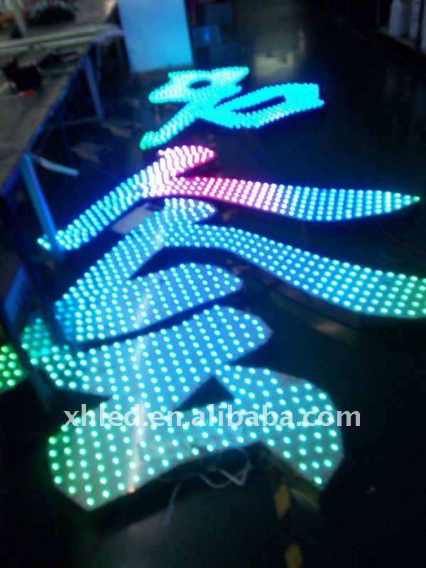 Outdoor large LED sign board glowing logo letters with RGB color running effect