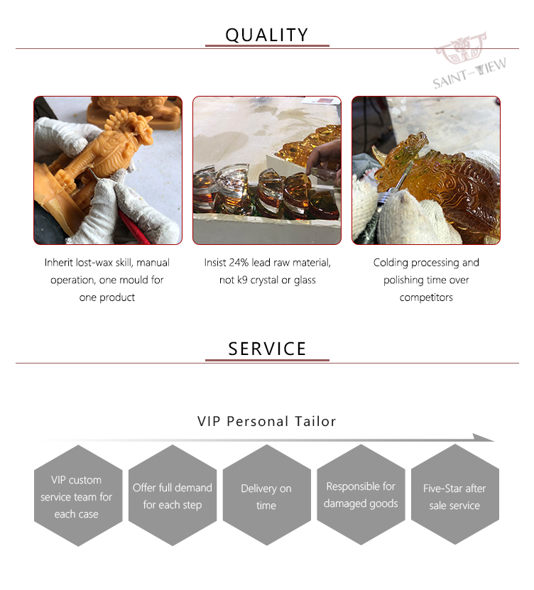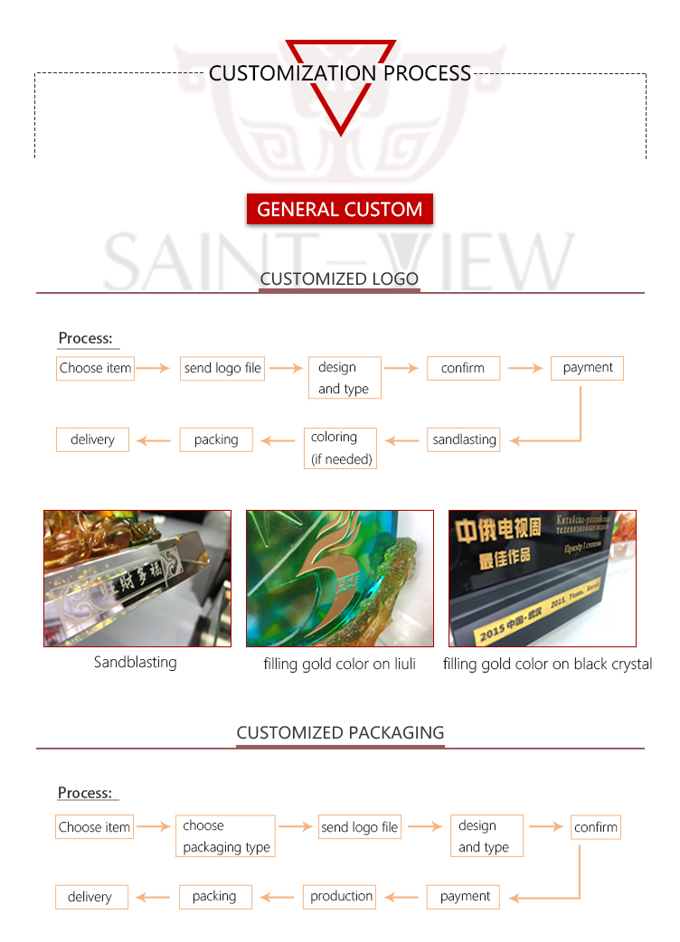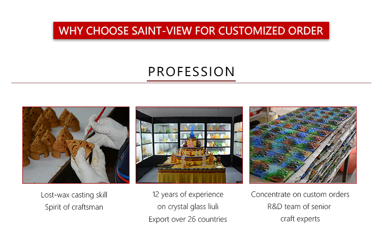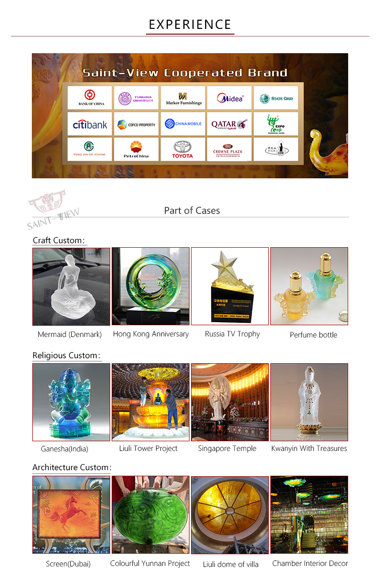 Saint-View is factory directly selling crystal glass liuli by lost-wax casting method, which is also known as pate de verre. Our products including: gift & craft, sculptures, figurines, buddha statues, vases, home decor items, plaque and brick for architecture, etc. We accept OEM&ODM customized production, offer designing, moulding, mass production and fitting solution for personalized cases.