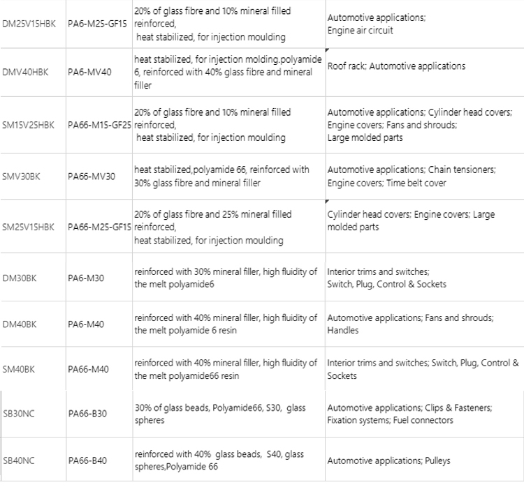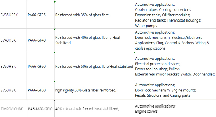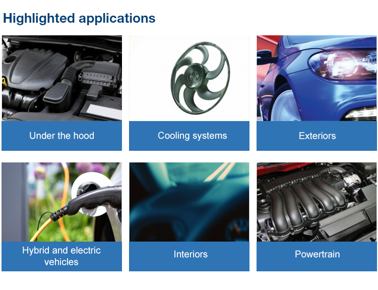 Automotive applications; Coolant pipes; Cooling connectors; Expansion tanks; Oil filter modules;Radiator end tanks; Thermostat housings; Water pumps