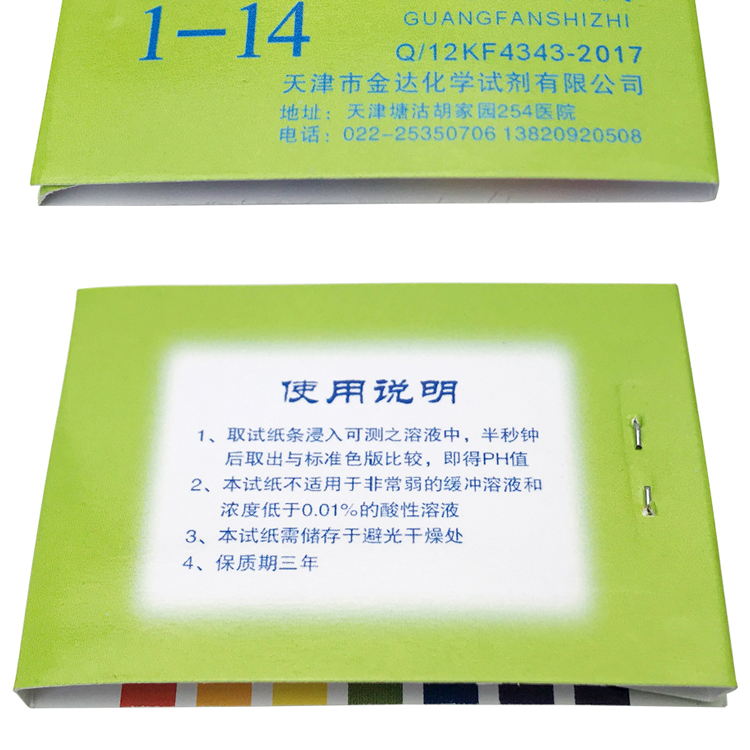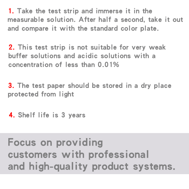 Test the pH value of the solution: tear off a strip of test paper, add the solution with a rubber dropper, change color in half a second, and compare with the color card on the package; or take a small amount of solution, directly wet the liquid and the test paper, and wrap the color card after half a second For comparison, you can also take a small piece of test paper and put it on the face plate or glass plate, immerse the liquid to be tested in the middle of the test paper with a clean cloth and dry the glass rod, observe the stable color, and compare it with the standard color card to judge the nature of the solution.