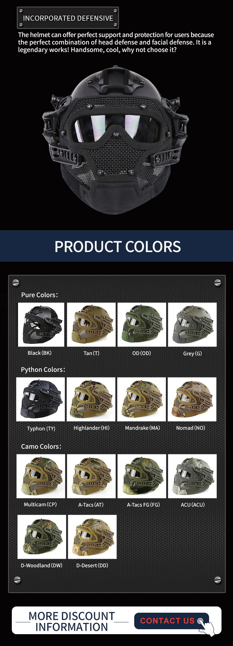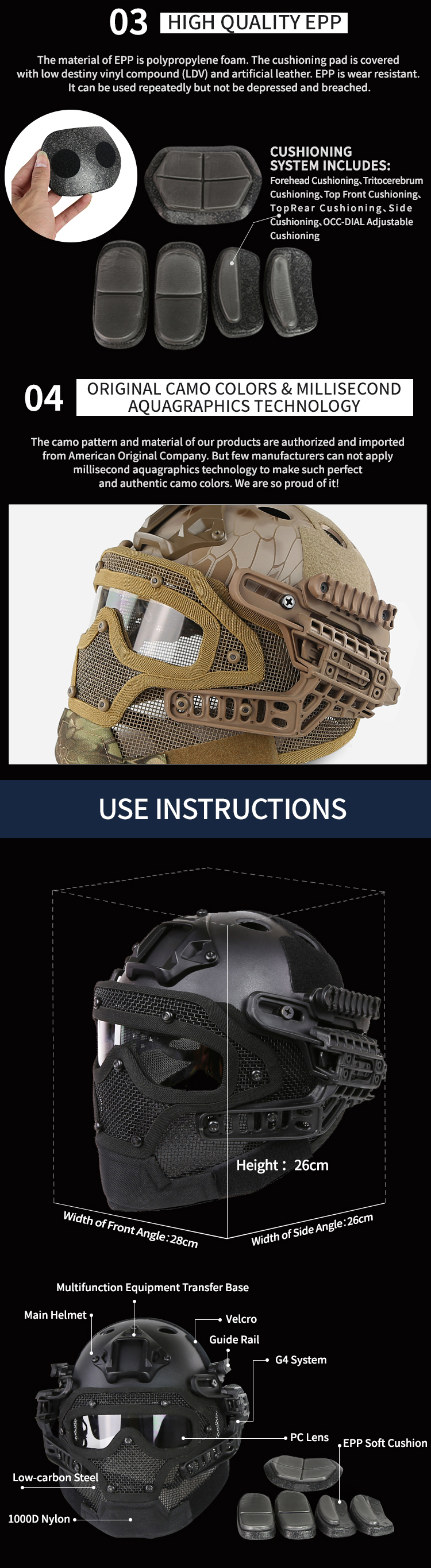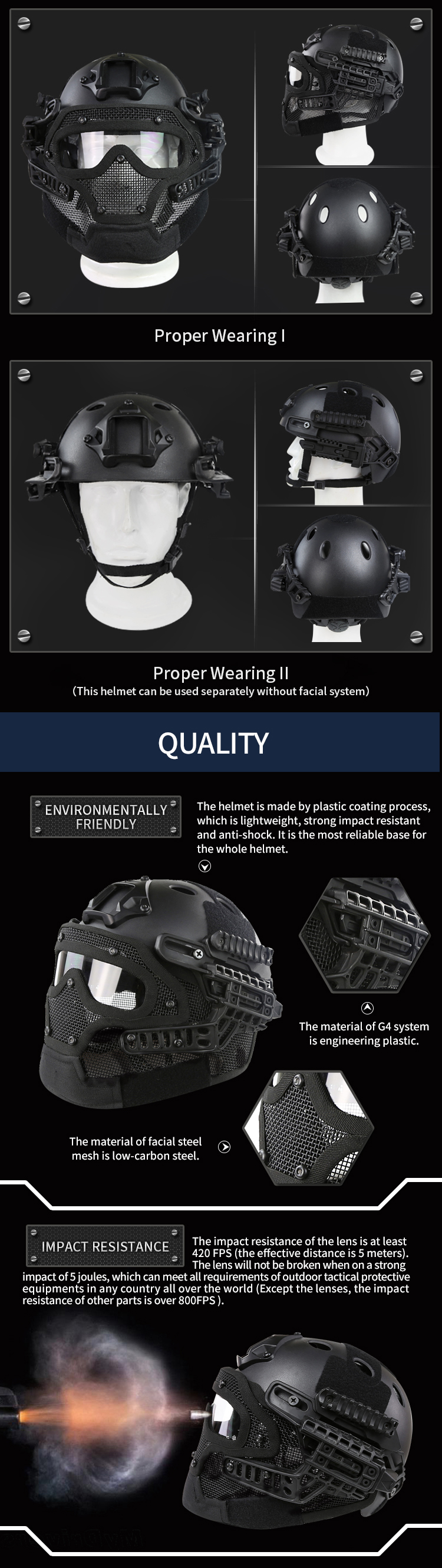 1. This lightweight helmet can be retrofitted. But it is recommended to modify the accessories first, because when the helmet is modified first, the standard accessories cannot be installed (standard accessories refer to the accessories that are directly installed on the helmet without modification). 2. This mask can be used at a temperature of -10°C. Note that as the temperature decreases, the hardness of the product will increase and the toughness will decrease. 3. The mask has not been tested at a temperature above 42°C, and the relevant data is not clear. 4. Children under the age of 12 are prohibited from using it. It is recommended that teenagers should be accompanied by their parents and read the instructions carefully before use. 5. The user must wear the helmet correctly when using it. The helmet cannot be moved, which plays a protective role for the user. 6. Due to the temperature difference, the inside and outside may fold. Press it and the fold disappears. 7. Wosport products that are labeled as being compatible with Fast helmets are regarded as standard accessories; more importantly, Fast helmets can be adapted to many accessories on the market (installed directly on the helmet without modification) (accessories: except for Fast helmets any functional equipment) 8. The impact resistance of the lens is at least 420 FPS (effective distance is 5 meters). The lens will not break under a strong impact of 5 joules, which can meet all the requirements of outdoor tactical protective equipment in any country in the world. 9. The lens has been treated with anti-fog, but if the relative humidity and relative temperature are too high, please choose the treatment method of the lens by yourself. 10. The steel mesh surface coating of this product has excellent impact resistance and can withstand 500FPS (effective distance of seven meters) without causing damage to the coating, which is at the international top level. |