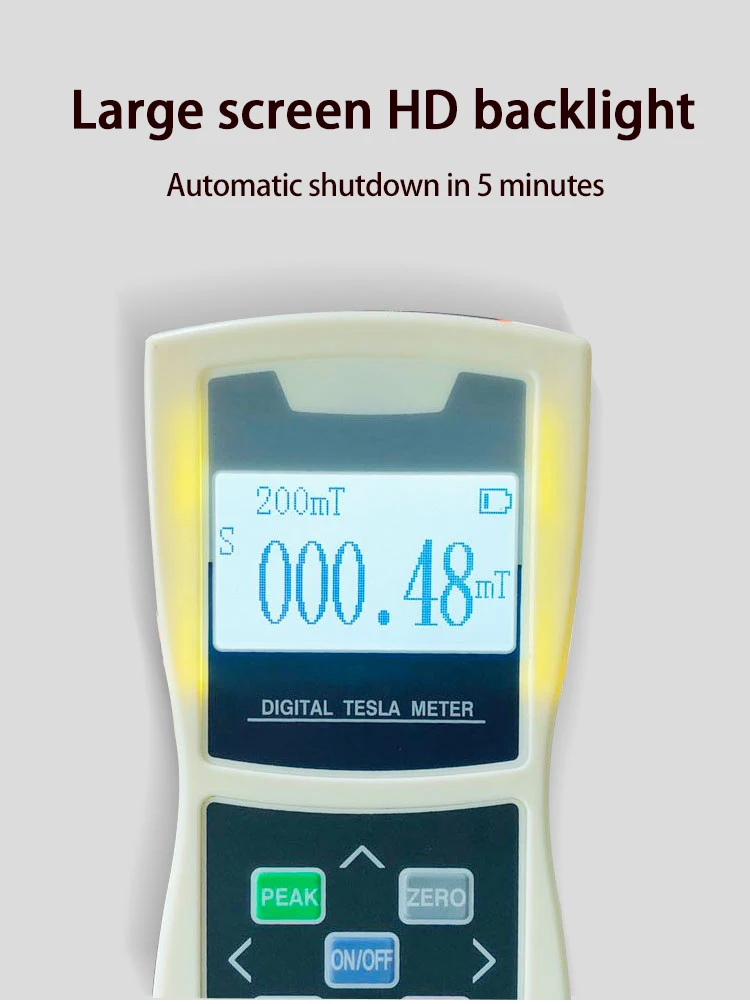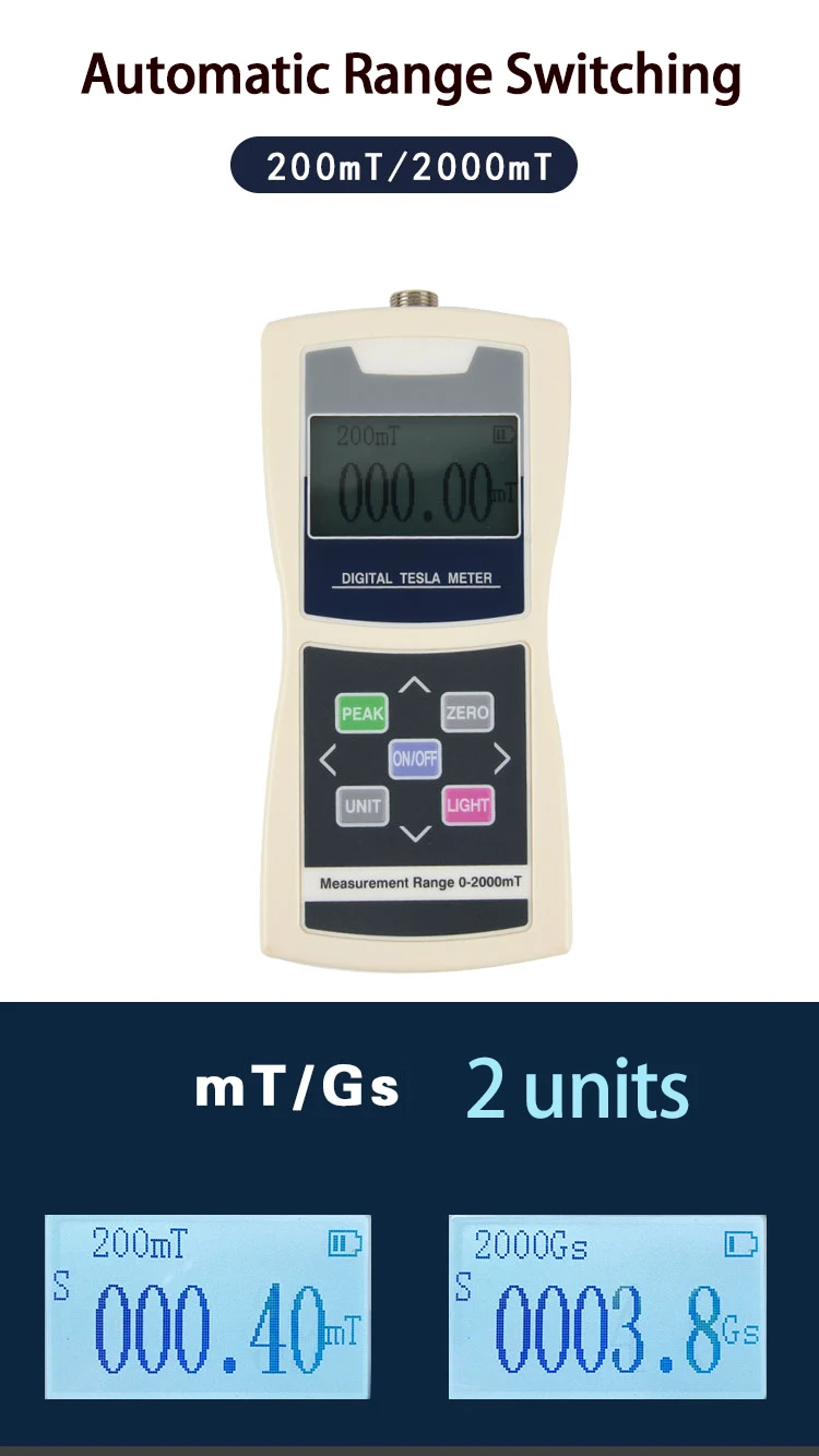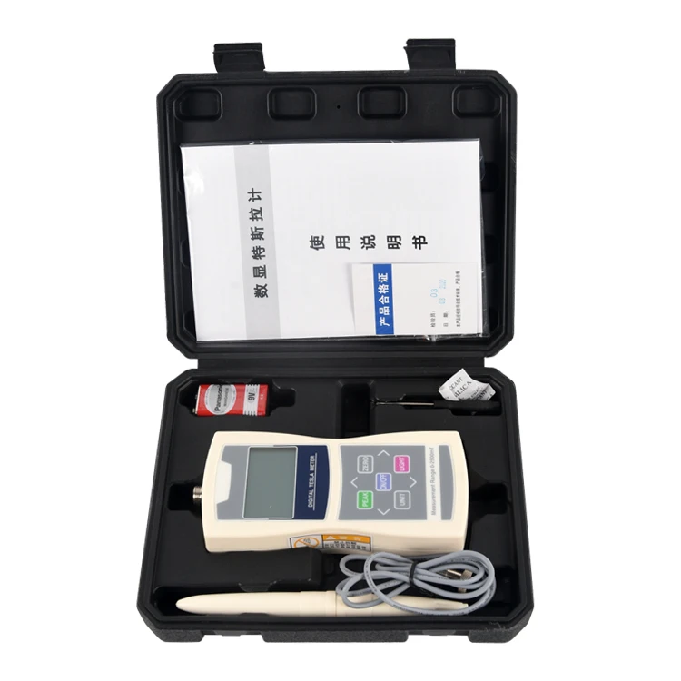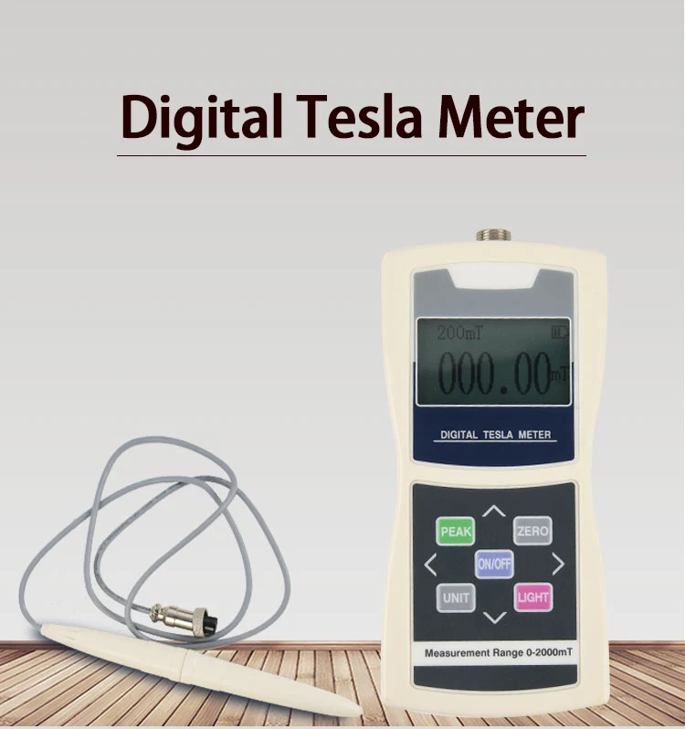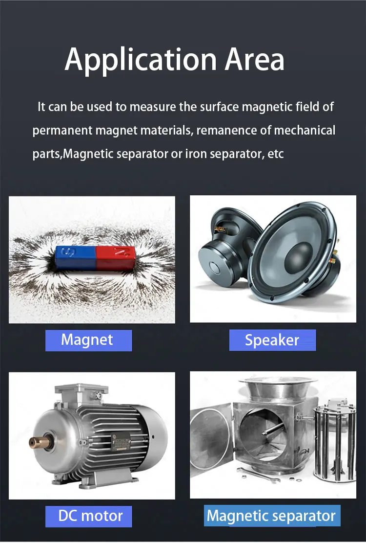Handheld Digital Tesla Meter Gaussmeter Surface Magnetic Field Tester with Probe 0-2400mT Tesla meter is a portable, multifunctional magnetic field measuring instrument equipped with high sensitivity, low drift hall sensor, and the application of advanced digital signal processing technology, suitable for measuring surface magnetic field of permanent, remanence of mechanical parts, magnetic separator or iron remover, etc. It can be used as a basic magnetic parameter measuring instrument in magnetic material manufacturers and companies, mechanical manufacturing enterprises, scientific research institute in colleges and universities.