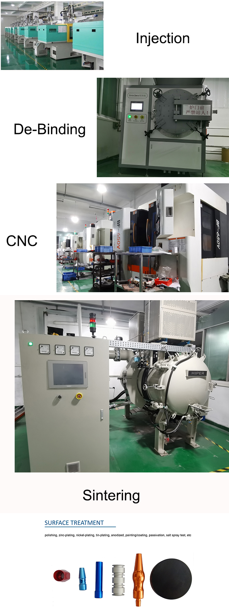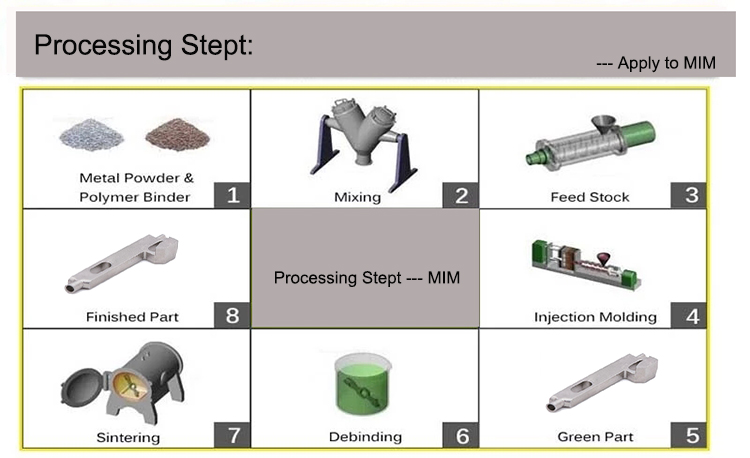 Mixing, pelletizing, injection, degumming, sintering, CNC columnprocess. |