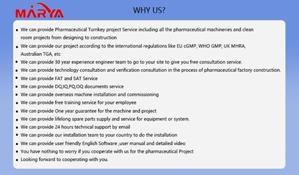 Shanghai Maria Pharmaceutical Engineering Project Co., Ltd. is a manufacturer specializing in pharmaceutical packaging machinery and clean room systems. We have 3 factories in Shanghai, Suzhou and Changsha. Our main products include BFS machine, soft bag filling and sealing machine, blister packaging machine (tablet/capsule/ampule/vial/syringe blister packaging machine), strip packaging machine, tablet counting machine, cartoning machine , ampoule filling machine, vial powder filling machine, dry granulator, etc. As a manufacturer, we can provide more favorable prices and better technical support and services than trading companies. We can design and manufacture machines according to customers' requirements, your satisfaction is our top priority. Our machines have been sold all over the country and exported to Southeast Asia, America, Europe, the Middle East, Africa and other countries and regions. Welcome to visit our factory.