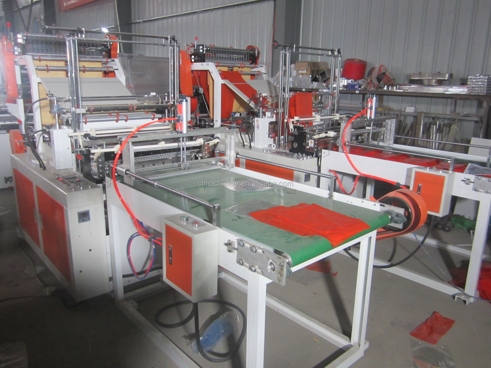 Plastic bag cutting machines are used to produce flat bottom shopping bags.