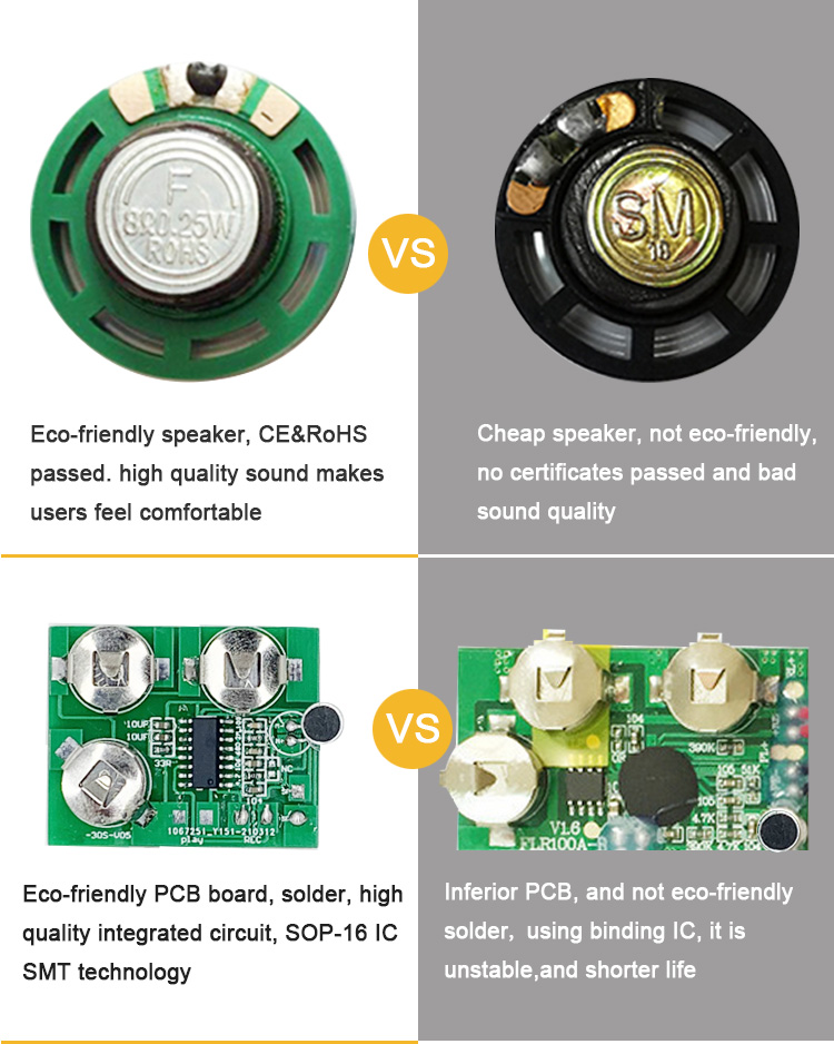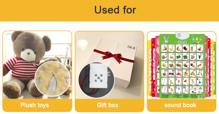 | Used for: | Toys, dolls, boxes, audiobooks, etc. | Element: | ABS case, PCB, IC, speaker, battery, etc. |