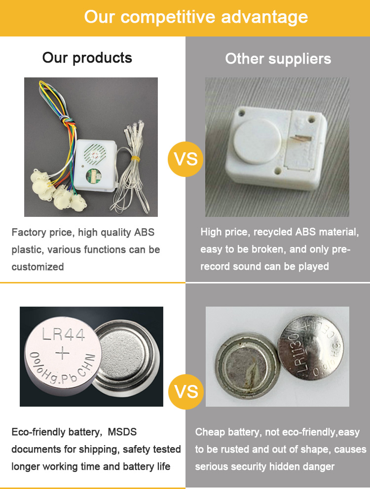 Pre-recorded sound module:Customers need to provide us with sound files in MP3/WAV format, then we help to program and put in sound modules. For sound, the sound duration is 1-300 seconds or custom. You can make many different types of sounds and it will play in sequence.