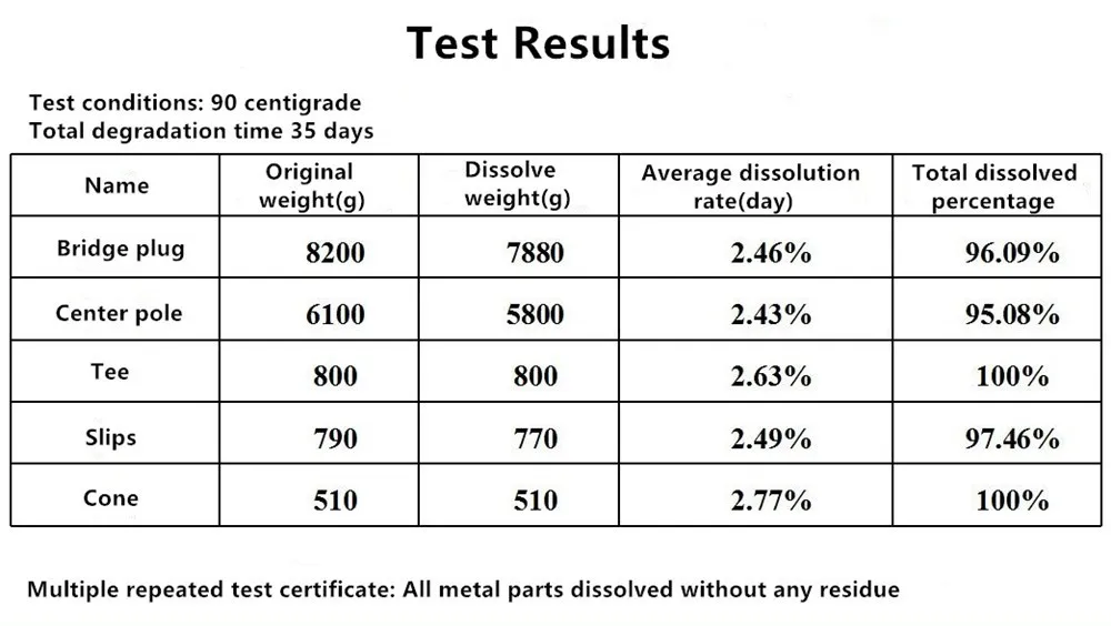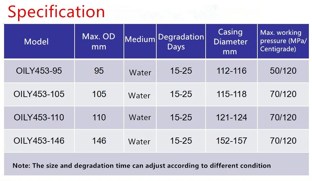 WINGOIL has developed four series of soluble bridge plugs under working temperature (60-80℃, 80-100℃, 100-120℃, 120-150℃), the bridge plug outer diameter is from 95mm to 146mm. All models have been verified by oil and gas well operations, and the success rate is 100%.