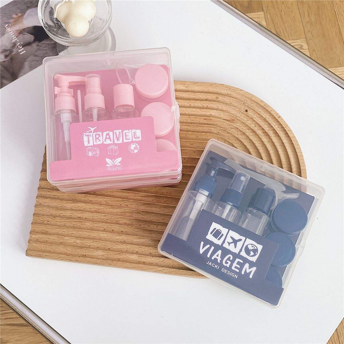 Popular Fast Delivery Custom 8 Pieces Travel Plastic Bottle Jar Set Kit With Lotion Pump Spray Plastic Box