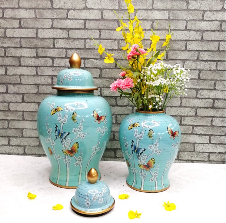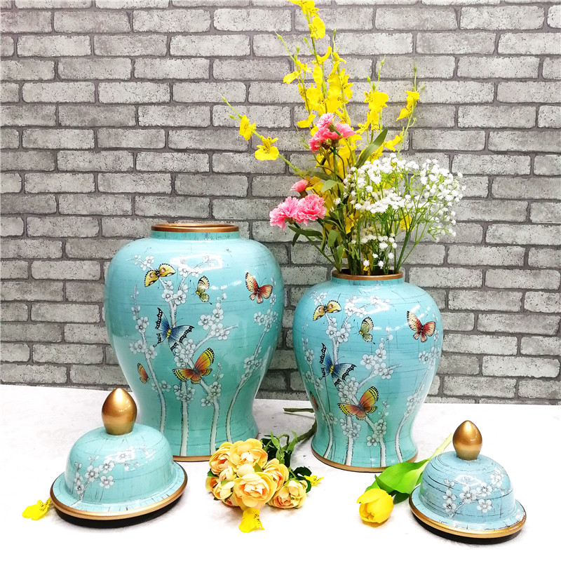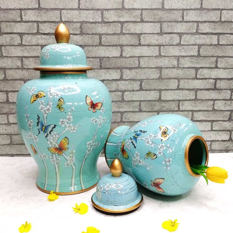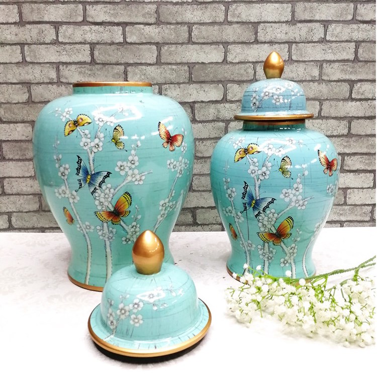 Popular green cute European style ceramic food storage jar for decor Butterfly print large ginger jar set