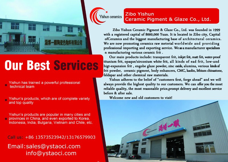 Zibo Yishun Ceramic Color Glaze Co., Ltd.Founded in 1999, Zibo Ceramics Co., Ltd. is located in Zibo City, the capital of ceramics and the largest production base of ceramic materials in China. We are now promoting ceramic raw materials worldwide and providing professional import and export services. We are a professional manufacturer of various ceramic raw materials. Our main products are: various ceramic frits (transparent frit, inkjet frit, matte frit, waterproof titanium frit, opaque/zirconium white frit, lead frit, small and large COE frit, frit powder), zinc oxide, aluminum oxide, CMC, kaolin, lithium porcelain stone powder, feldspar, ceramic pigments (various colors) and other chemical raw materials for ceramics. ..
