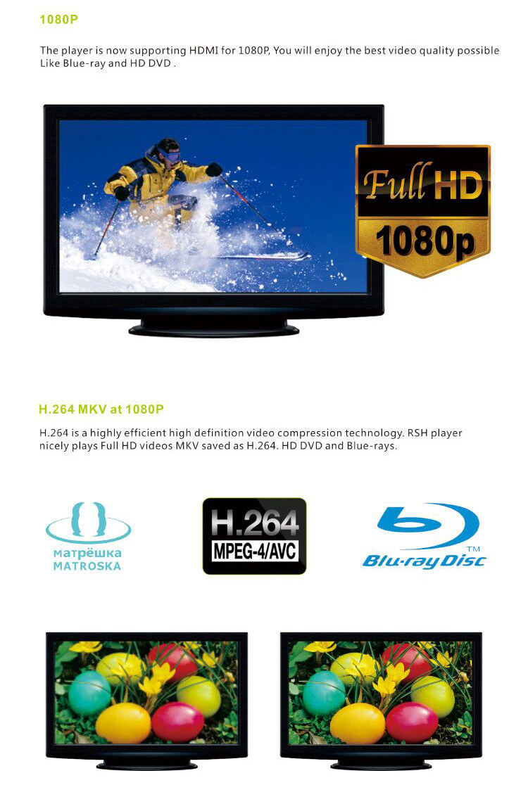 MKV(Mpeg2,RMVB,WMV9,Xvid,H.264 Max bit rate: 50Mbps) | ||
