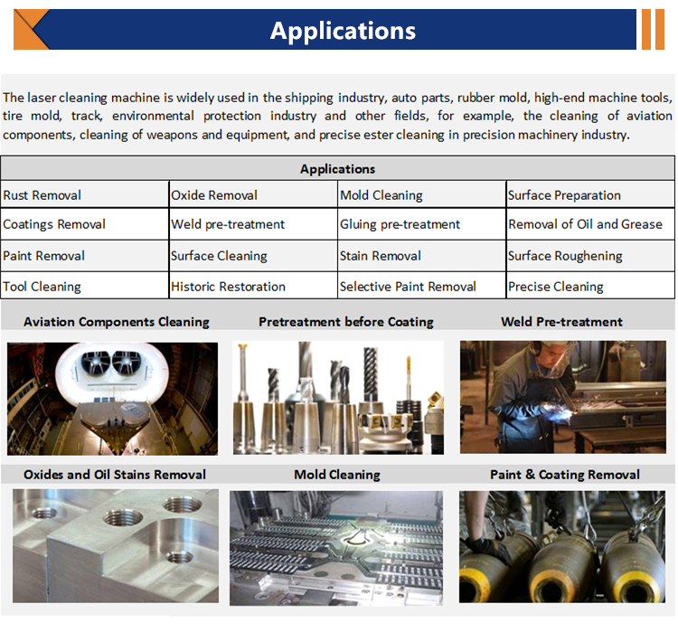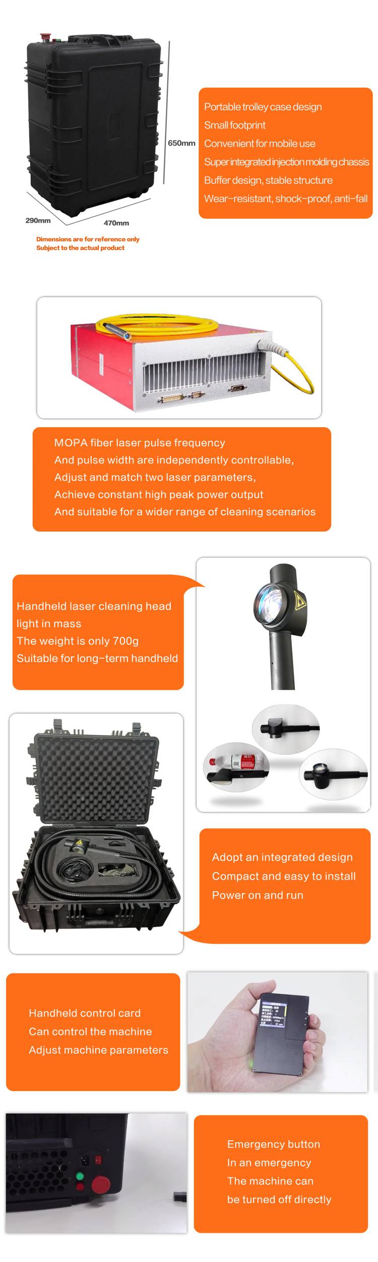 Mobile laser cleaning machine is a new generation of surface cleaning high-tech products. It is very easy to install and operate. It can be used without chemical reagents, media, dust-free and water-free cleaning, and has the advantages of automatic focus, surface cleaning with cranks, and high surface cleanliness.