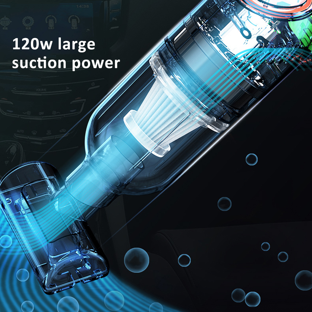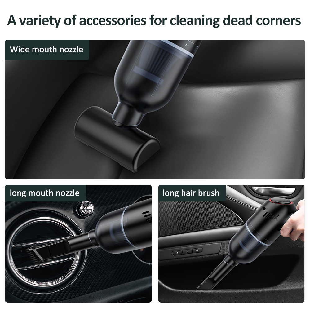 2. 120W high suction power, three professional accessories, thoroughly clean the hard-to-reach dead corners such as sofas, stairs, keyboards, cars, etc., easily suck away dust and debris, and make the car and home look brand new.