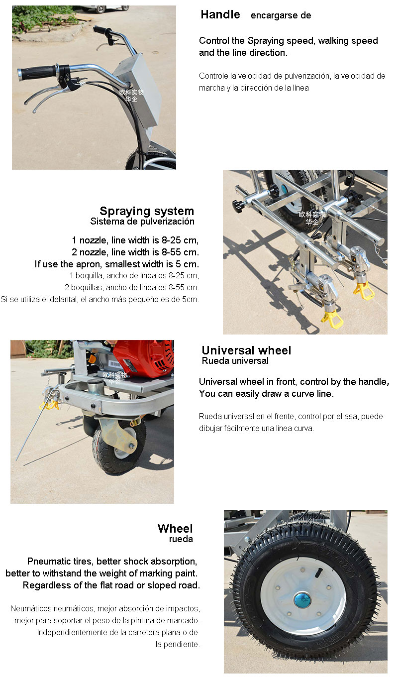 Front swivel wheel cold paint spraying road marking machine coating width up to tp 50cm, according to requirements, this type of road marking machine can paint narrow lines 5cm, you can use our machine on the plastic track.