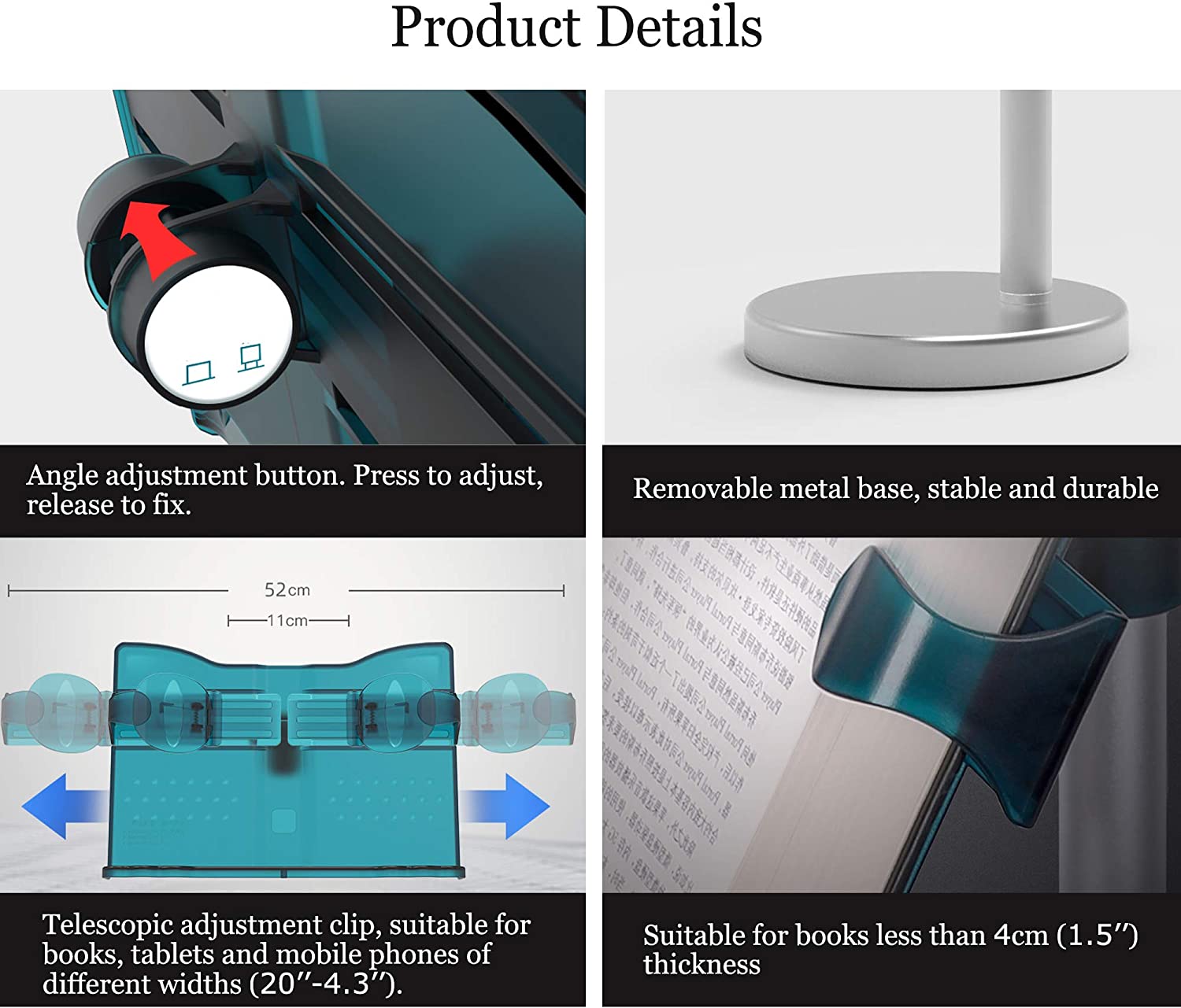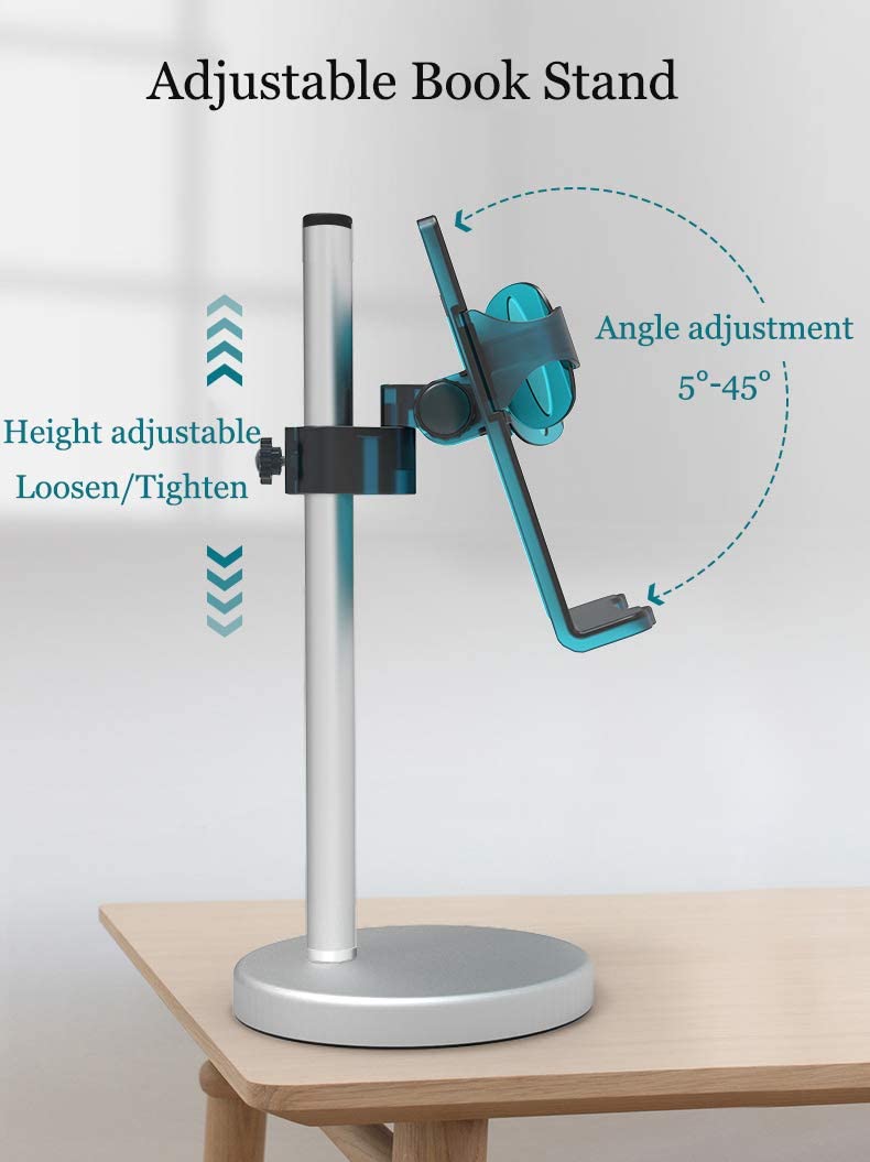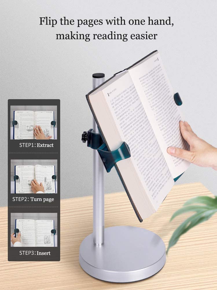 Adjust reading height 0-180 degrees/non-slip silicone pad/silicone cover clip |