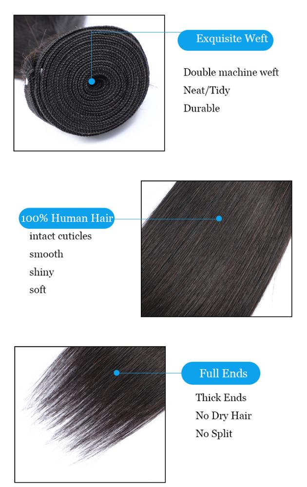 | quality | 1. 100% Virgin Hair, 100% Human Hair, 100% Unprocessed Hair, 100% Brazilian Hair, Indian Hair, Malaysian Hair, Young Girl Hair, from one donor 2. Soft, clean, healthy hair ends without lice or knits 3. No falling off, no tangle, double weft drawing 4. Can be ironed, dyed, bleached 5. Maintains texture after washing and with proper care for at least 1 year |
