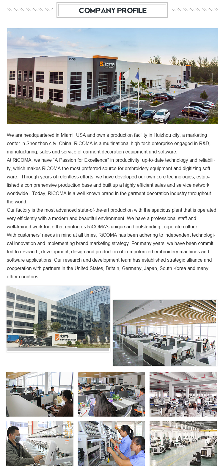 A: We are headquartered in Miami, USA, with a production plant in Huizhou and a marketing center in Shenzhen, China. RiCOMA is a multinational high-tech enterprise engaged in R&D, manufacturing, sales and service of clothing decoration equipment and software.