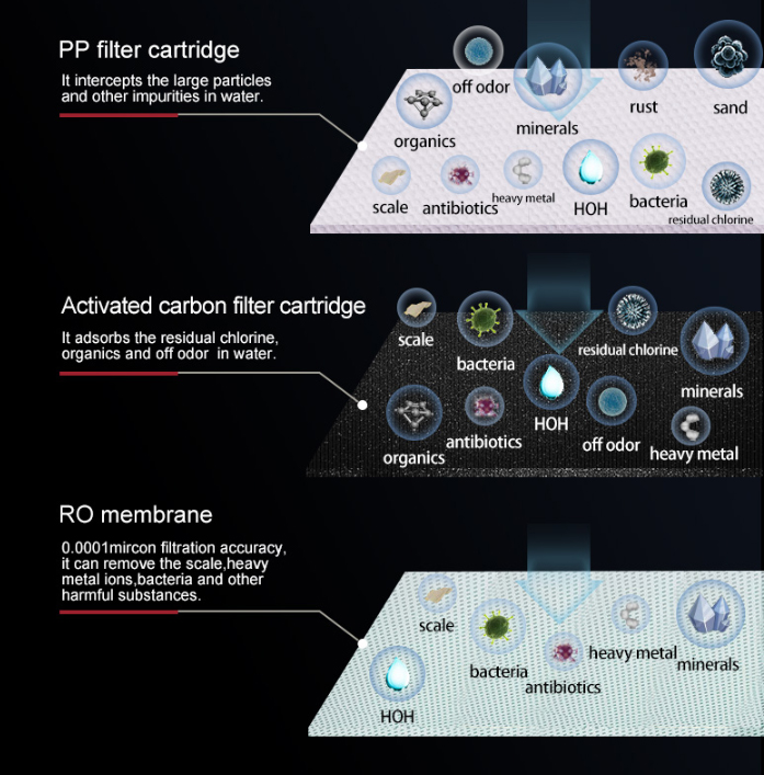 Inner filter element: PP+ACF+RO+RO or (0.22um origami ACF+1000G RO)x2