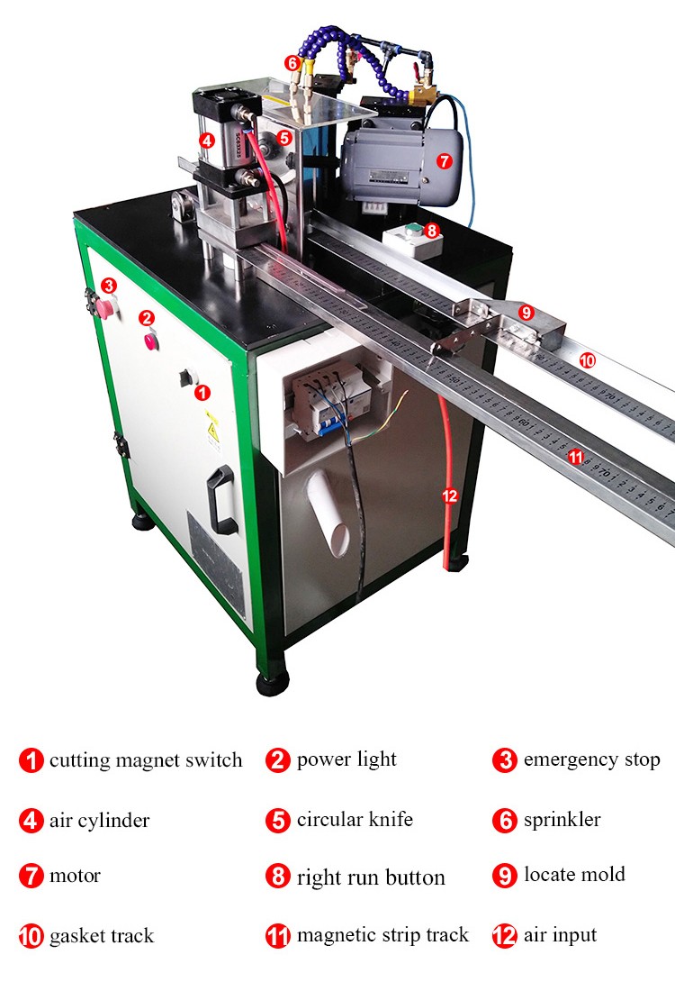 This manual refrigerator door rubber gasket cutting machine adopts a circular saw blade, which can cut both ends of the gasket and the corners of the rubber magnetic strip together. It has the characteristics of simple operation and convenient movement. The blade is rotated by a motor and moved by air pressure.