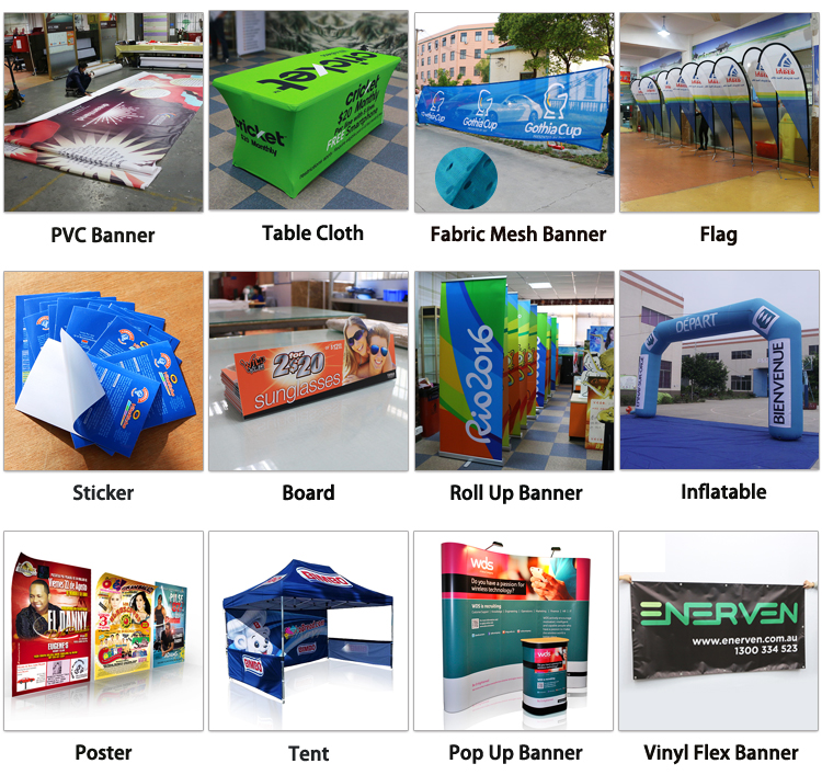 PVC Vinyl Banners, Fabric Banners, Mesh Banners, Beach Flags, Feather Flags, Teardrop Flags, Stickers, Boards, Billboards, Posters, Signs, Roll Up Banners, Pop Up Banners, Fabric Tension Displays, Display Stands, Tents, Inflatables, Tablecloths, etc.