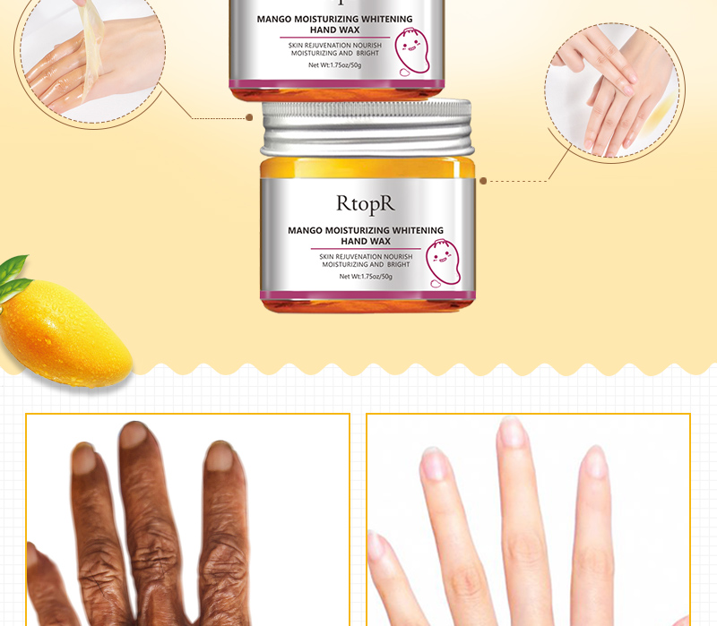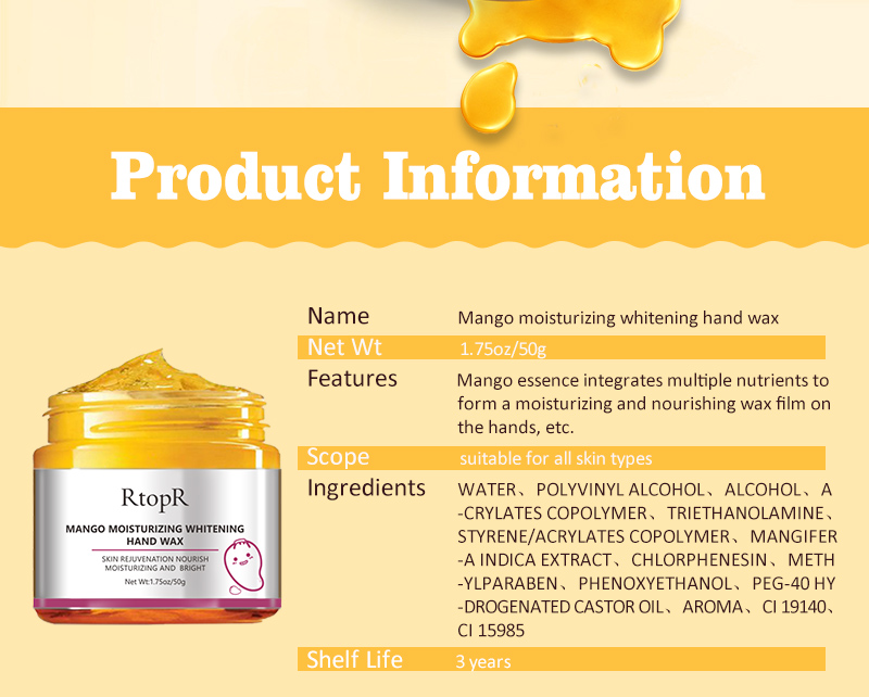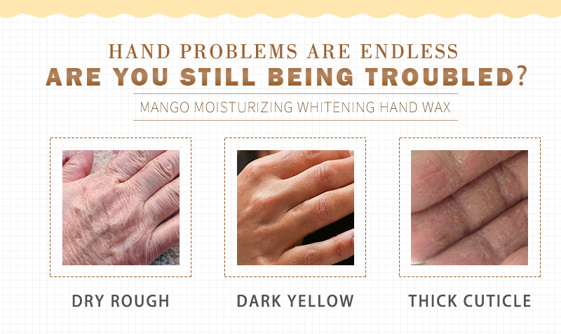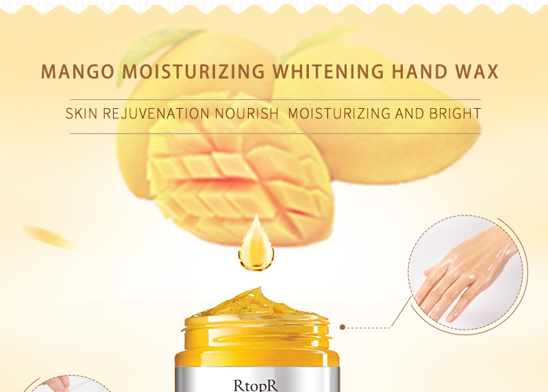 Mango essence combines a variety of nutrients to form a moisturizing and nourishing wax film on the hands, which gently and intensively nourishes the hands, relieves dry, rough, chapped, dull hands and other skin conditions, and at the same time helps to remove old cutin, whitening and translucent Skin and hands glow.