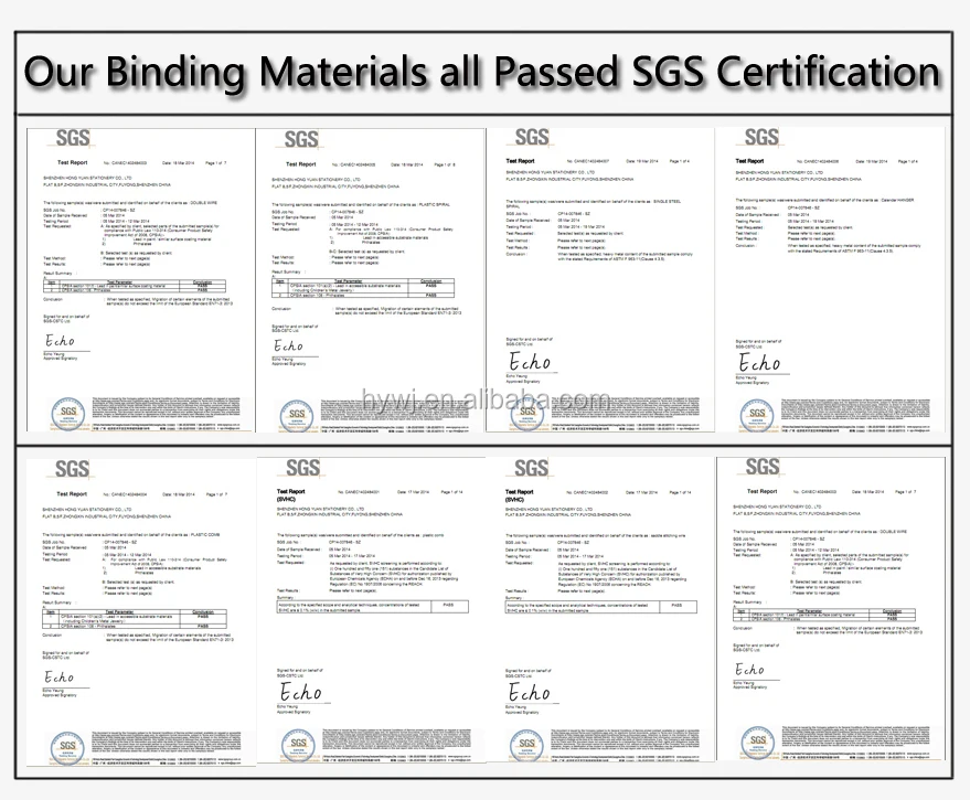 Our factory specilizes in manufacturing high quality book binding materials, such as nylon coated double loop wire, plastic coil, nylon coated metal coil, nylon coated calendar hanger, plastic comb...etc and related book binding machines. Our company has passed ISO9001 international quality system; All of our binding materials passed strict SGS testing and binding machines with CE certificate. They meet the standards of Euro-American markets