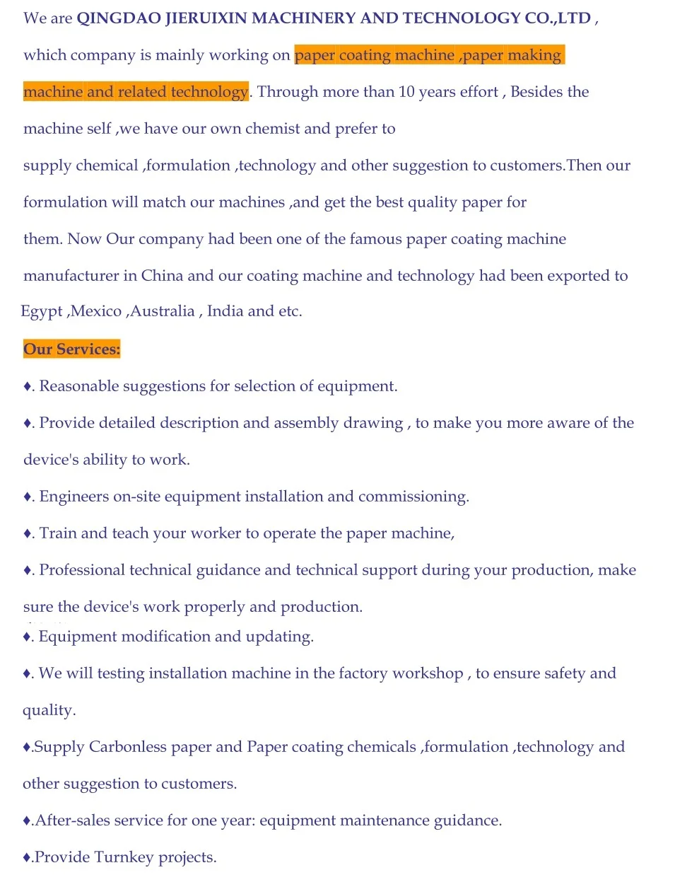⇓we have our own chemist and prefer to supply chemical ,formulation ,technology and other suggestion to customers.Then our formulation will match our machines ,and get the best quality paper for them.
