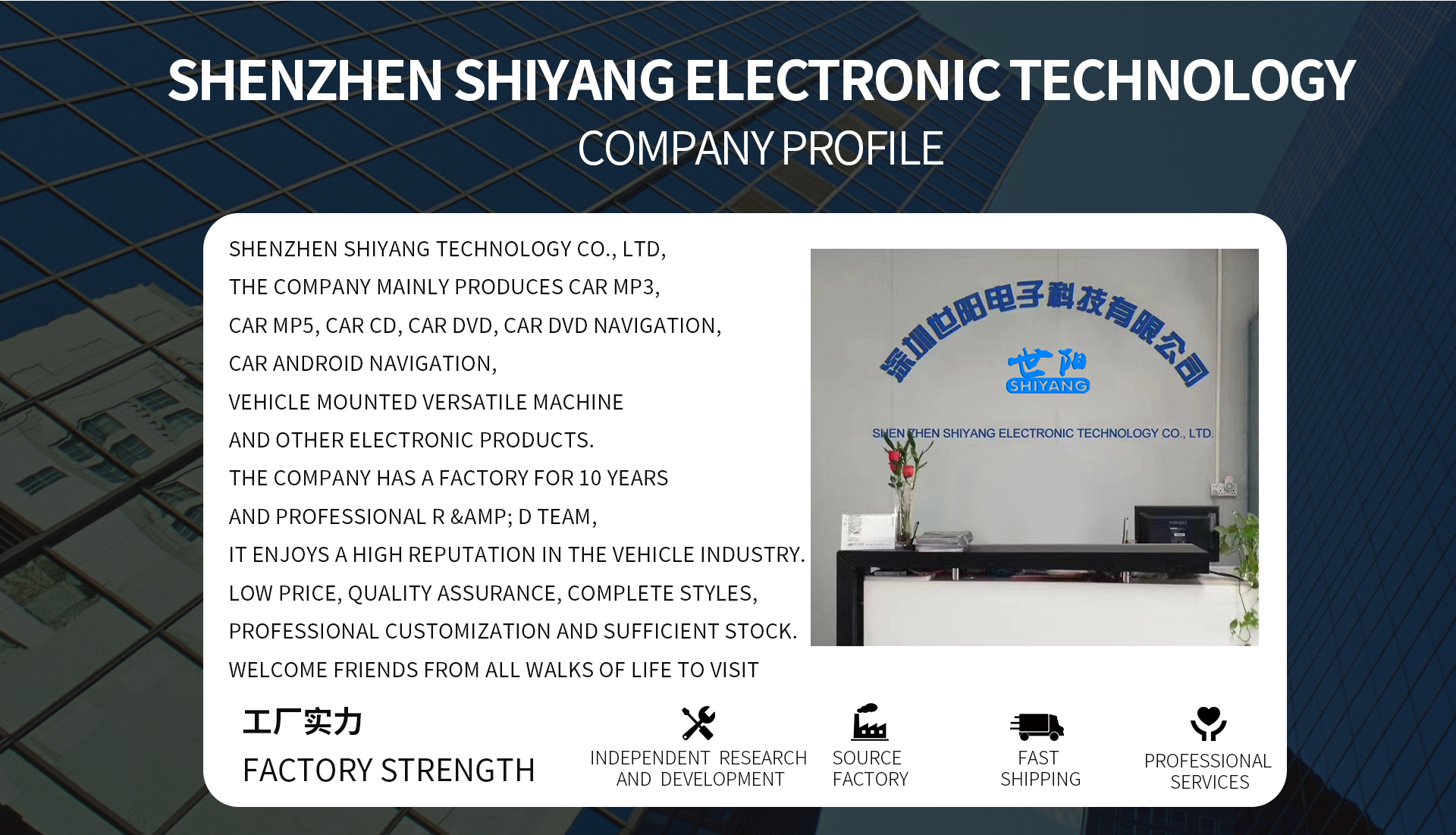 Shenzhen Shiyang Technology Co., Ltd. Our company mainly produces car MP3, car MP5, car CD, car DVD, car DVD navigation and other electronic products.