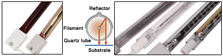 Reflector lamps focus infrared heat forward to where it is needed, reducing heat loss to the rear and increasing efficiency. The surface of the lamp is coated with a reflective coating, usually covering 180° of the quartz tube. Infrared heat is emitted forward through the quartz tube, or reflected from the back of the tube, and transmitted out the front. Infrared heat lamps or clear heat lamps with reflective coatings are available for various machines.