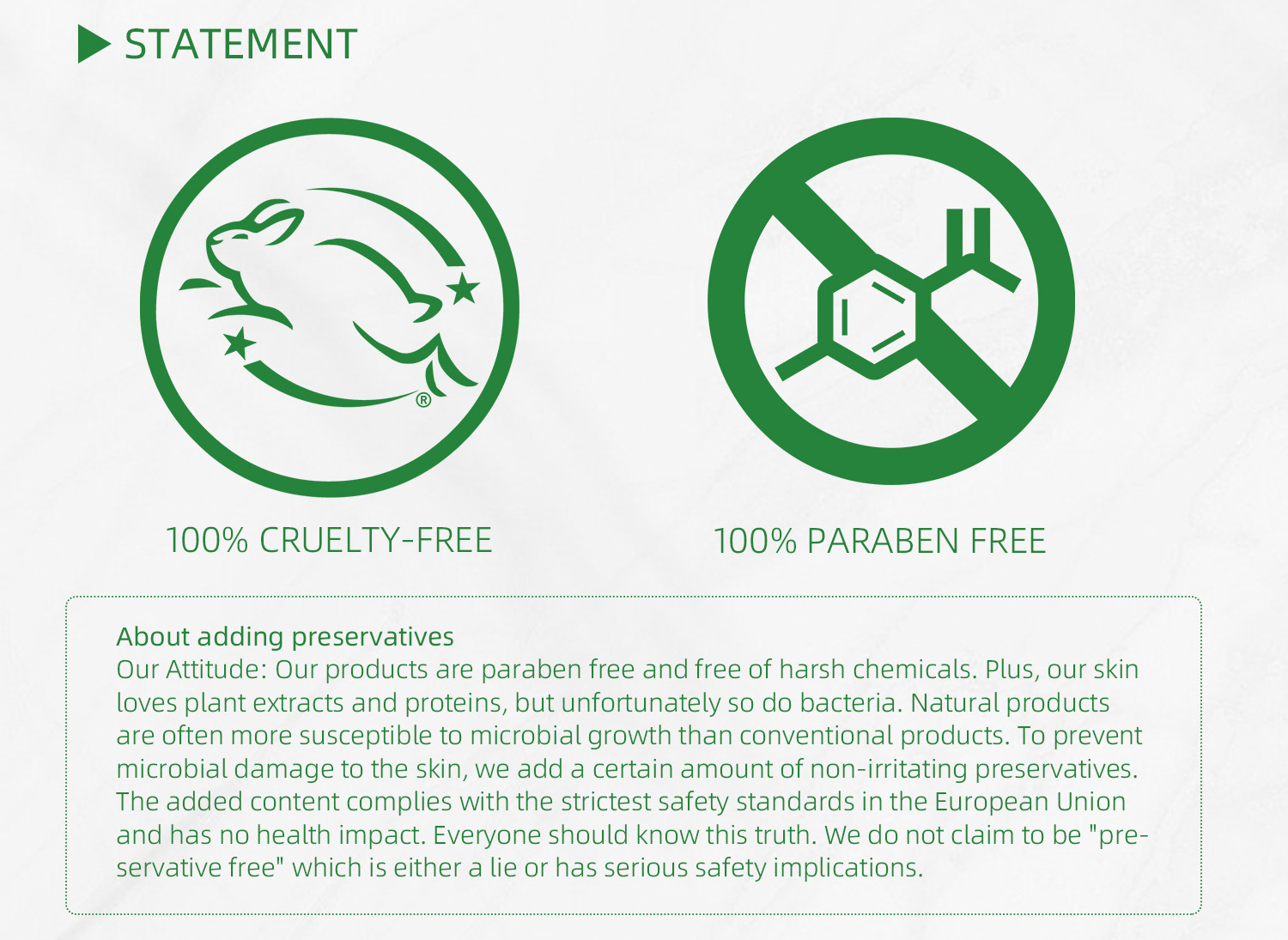 Our Attitude: Our products are paraben free and free of harsh chemicals. Plus, our skin loves plant extracts and proteins, but unfortunately so do bacteria. Natural products are generally more susceptible to microbial growth than conventional products. To prevent microbes from causing damage to the skin, we add a certain amount of non-irritating preservatives. The added content complies with the strictest safety standards in the EU and has no impact on health. Everyone should know this truth. We do not claim to be "Free of preservatives"It's either a lie or has serious security implications.
