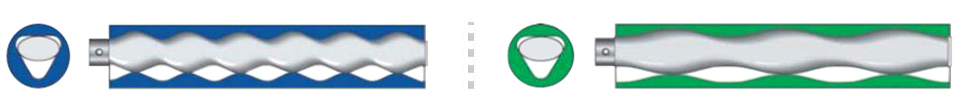 The shape of the single-stage screw pump with L-shaped geometry is the same as that of the S-type two-stage pump, and the diameter and eccentricity are the same. The rotor/stator pitch of the L-shaped geometry is twice that of the S-shaped geometry. Therefore, the pump has twice the flow compared to the S-shaped geometry with a maximum differential pressure of 6bar 85psi.
