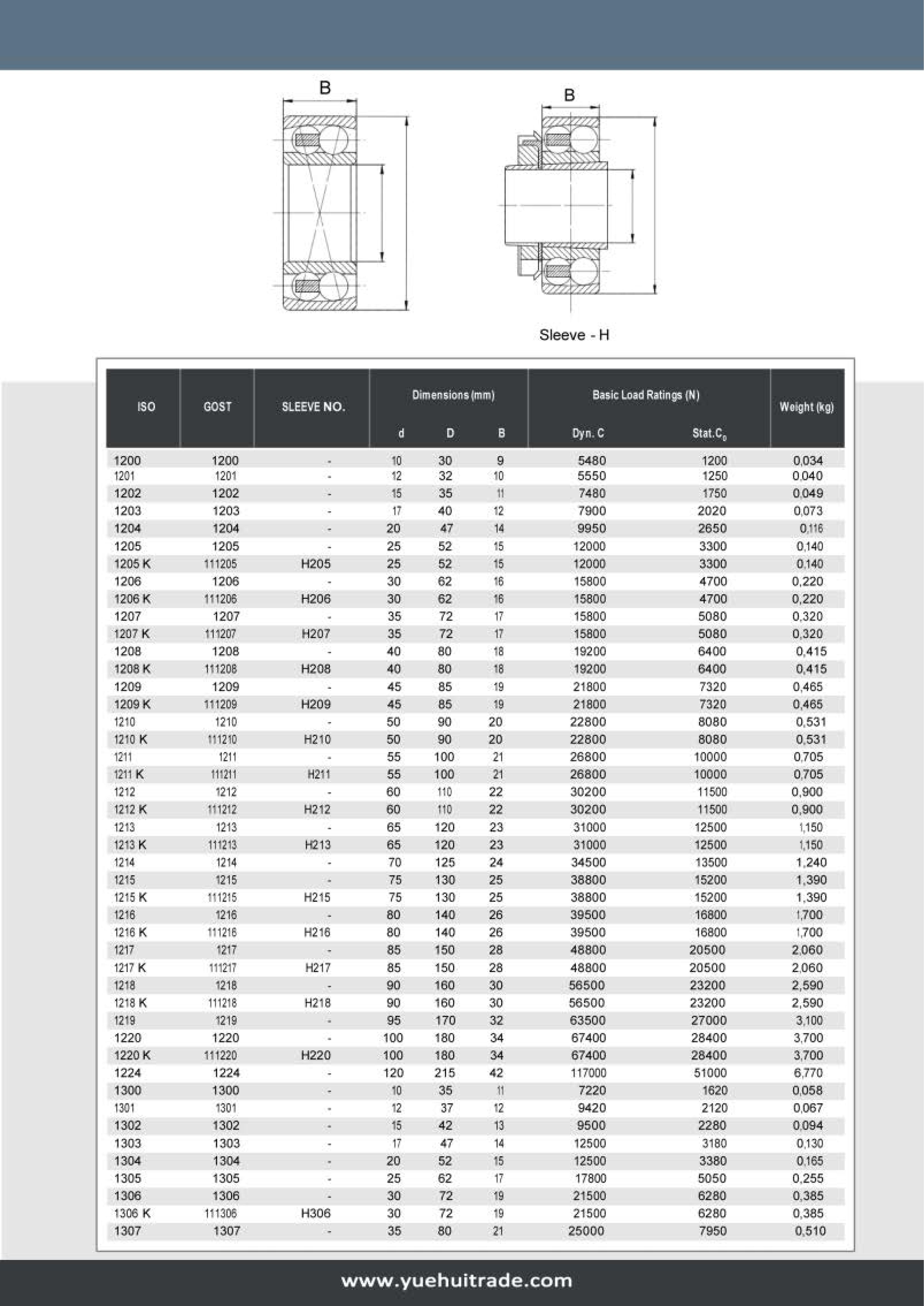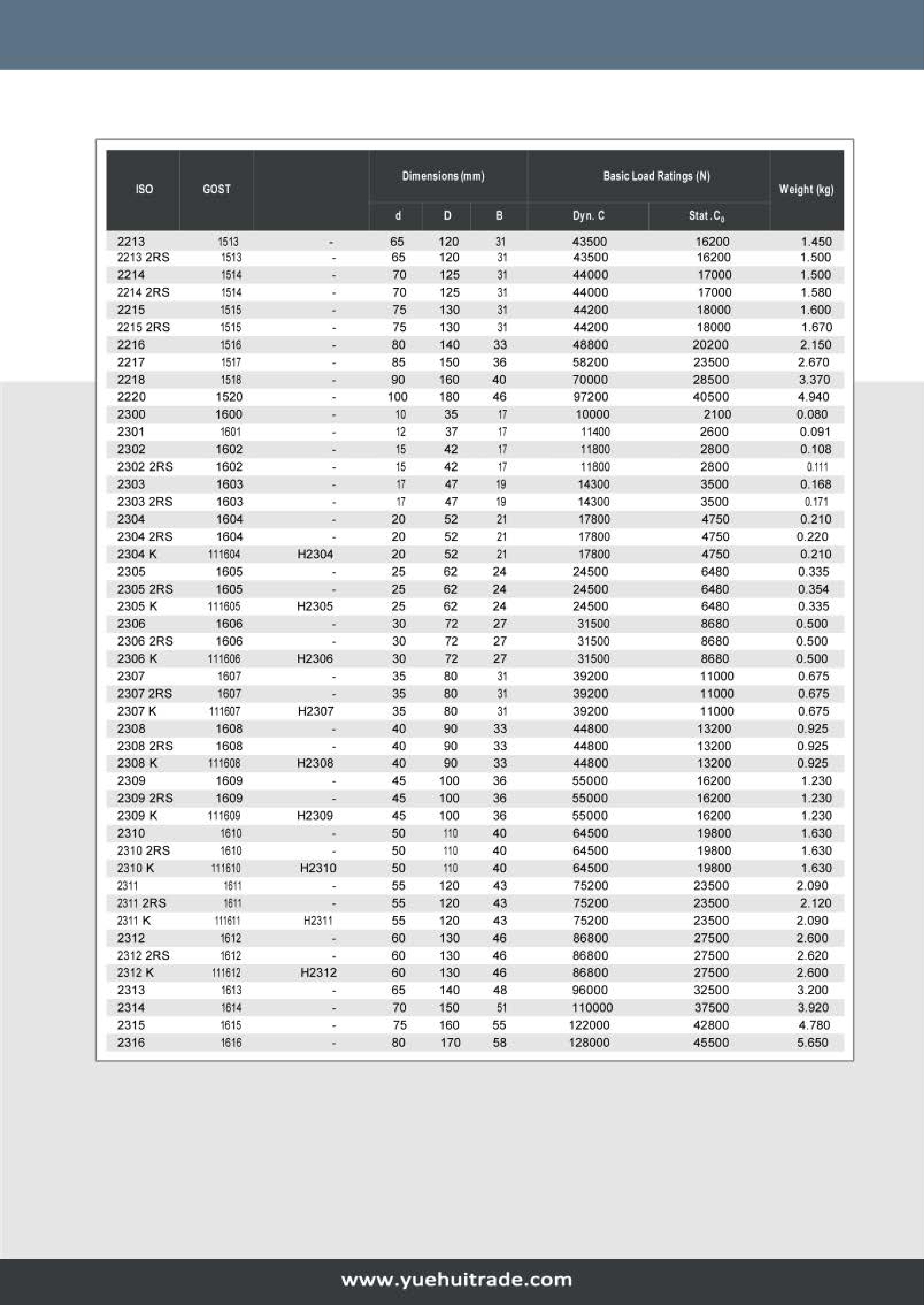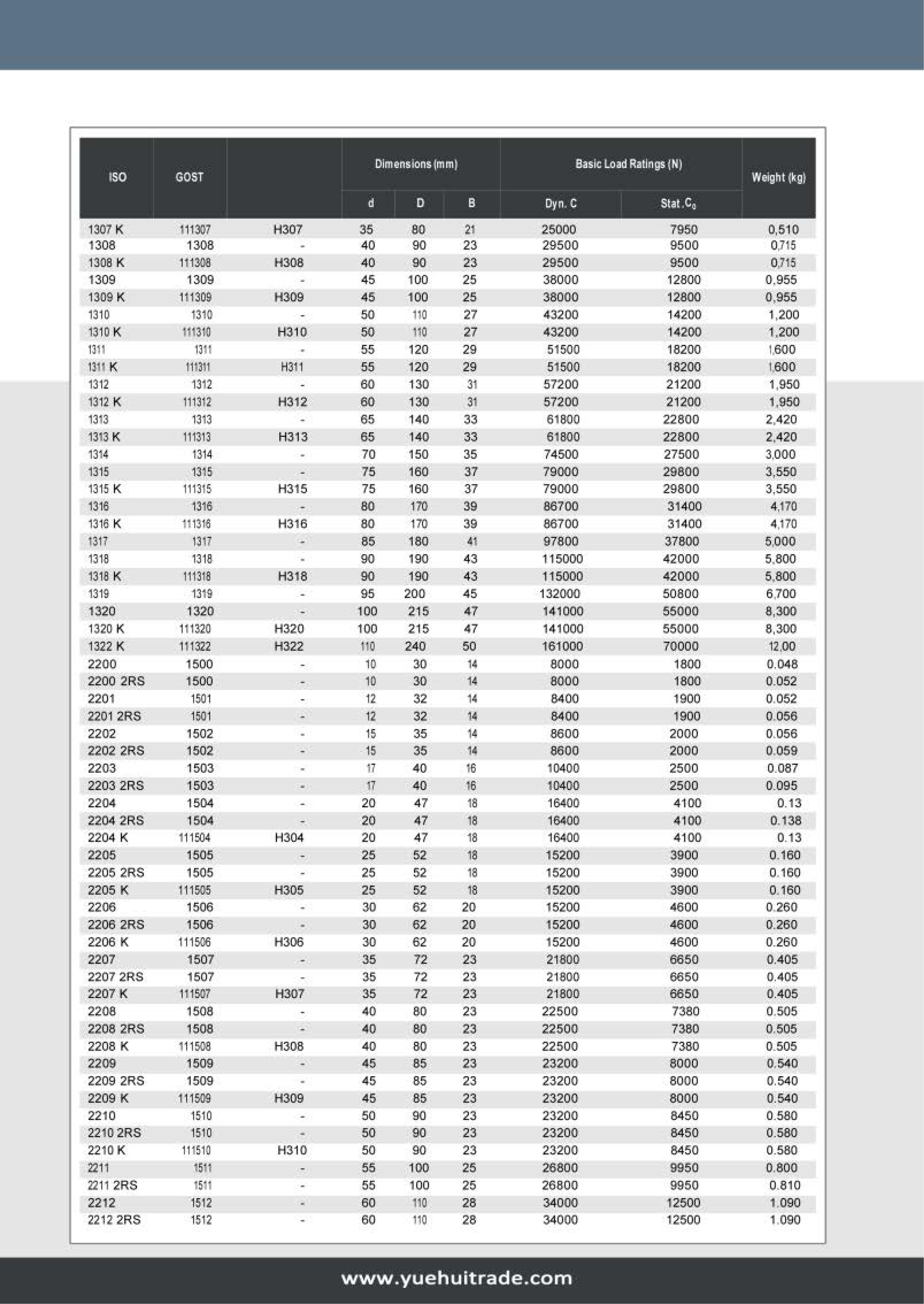 YHB recommends self-aligning ball bearings when the alignment of the shaft and housing is problematic and the shaft may be bent. The outer ring has a spherical raceway whose center of curvature coincides with that of the bearing; therefore, the axes of the inner ring, balls and cage can deflect to a certain extent about the center of the bearing.