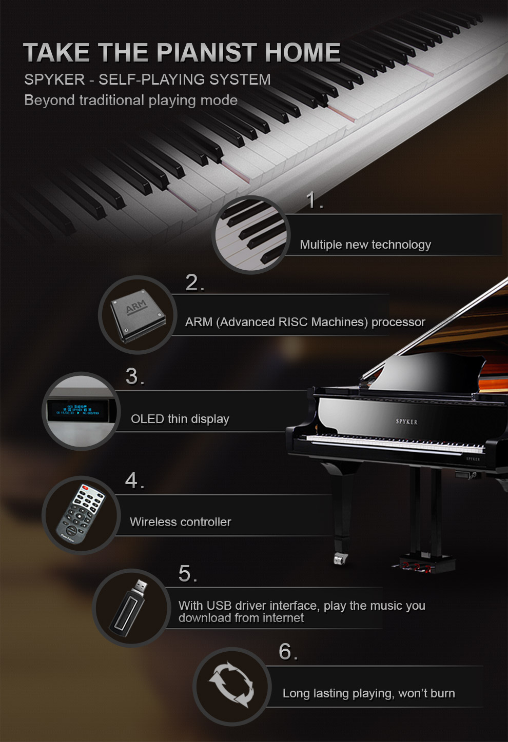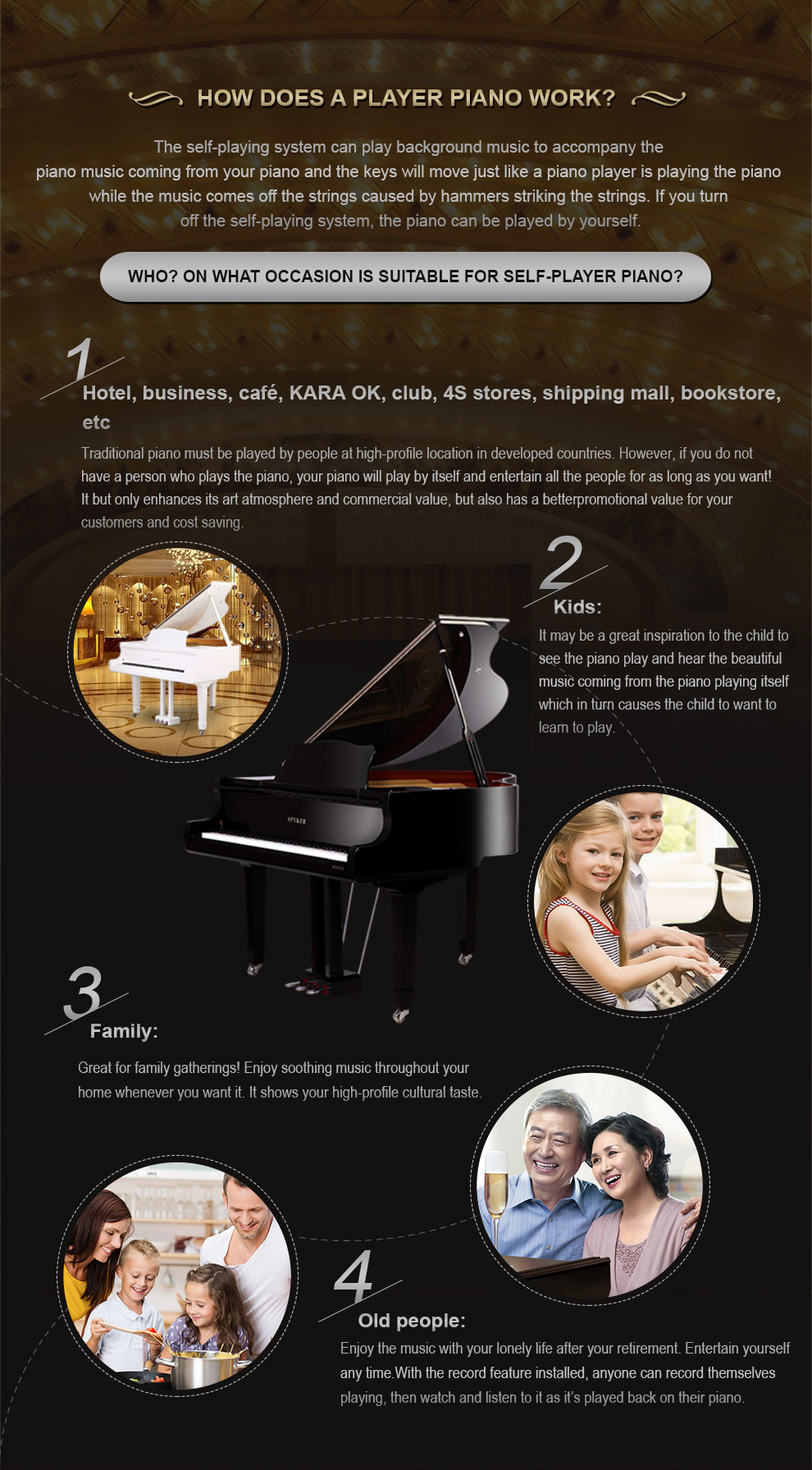 The self-playing system can play background music to accompany the piano music coming from your piano and the keys will move just like a piano player is playing the piano while the music comes off the strings caused by hammers striking the strings. If you turn of the self-playing system, the piano can be played by yourself.