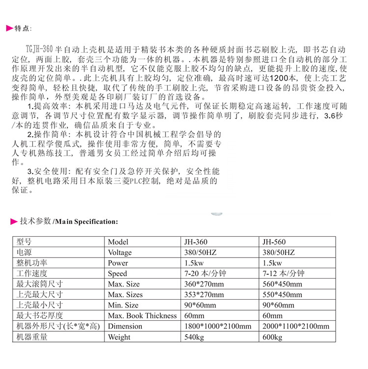 JH-560 semi-automatic cartoning machine is suitable for all kinds of hardcover book blocks, such as hardcover book cover brushing, that is, book block automatic positioning, double-sided gluing, cover function. This machine is a semi-automatic machine developed according to the working principle of imported full-automatic machines type. It can not only overcome the disadvantage of uneven glue application, but also increase the glue application speed and make the positioning of the cot simple. .The gluing machine is evenly glued, the positioning is accurate, and the maximum speed can reach 1200 volumes/hour, which makes the shelling process simple, easy and fast. It replaces the traditional manual brushing and shelling, and saves the expensive capital investment of purchasing imported equipment. , simple operation and beautiful appearance are the first choice equipment for printing and binding factories.