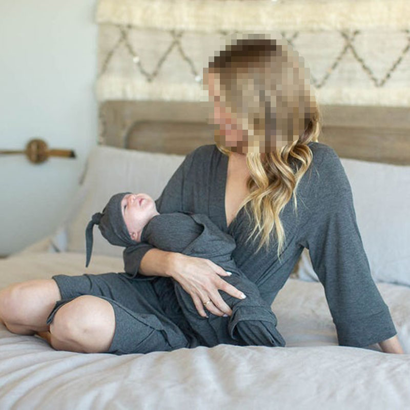 Set of 3 - Super Soft Dark Heather Grey Maternity Birth Care Gown and Matching Baby Swaddle Blanket and Newborn Hat Set