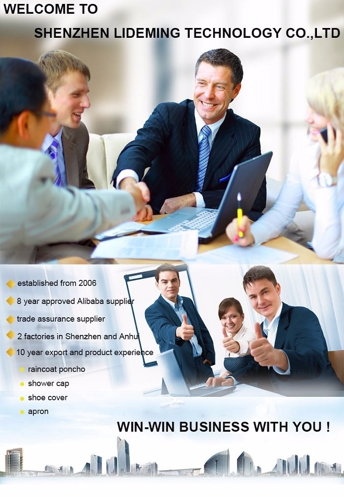 Established in 2006, Shenzhen Lide Ming Technology Co., Ltd. is one of the leading manufacturers. Specializing in the production of a series of waterproof ponchos, pouches, shower caps, shoe covers, we can do OEM and ODM according to customer requirements. Looking forward to any of your requests!