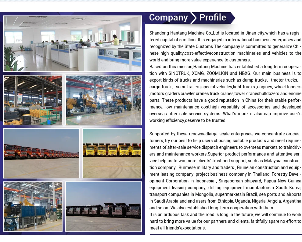 Shandong Han tang Machine Co., Ltd located in Jinan city, which has a registered capital of 5 million RMB.It is engaged in international business enterprises and recognized by the State customs. The company is committed to generalize Chinese high quality, cost-effective construction machineries and vehicles to the world and bring more value experience to customers.