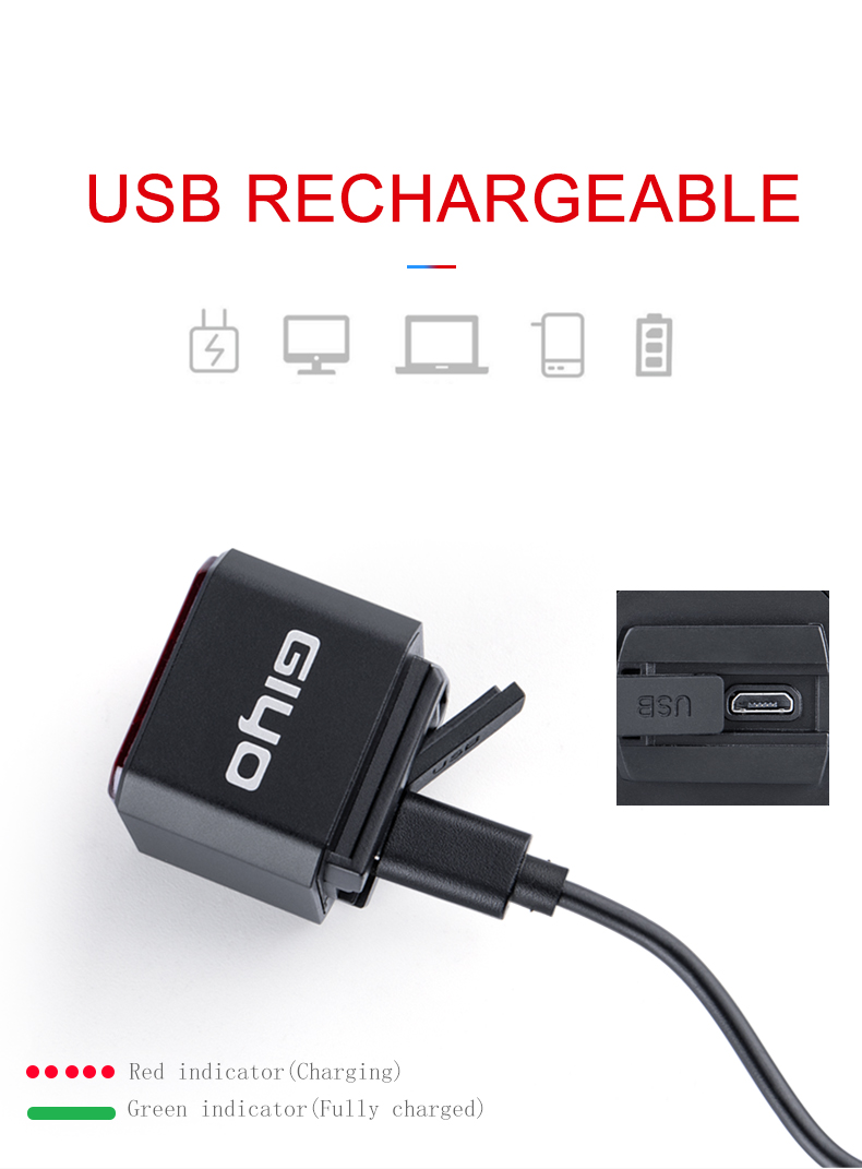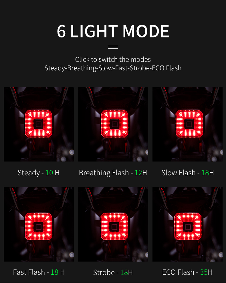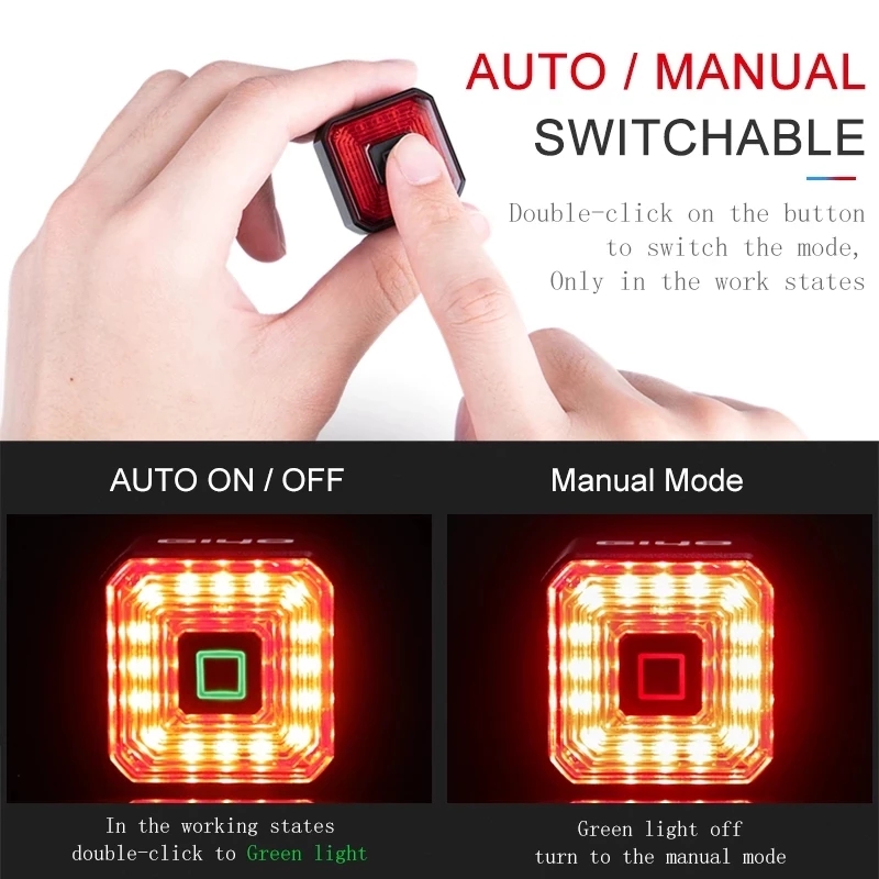 * [Auto/Manual Mode] Automatically turn on/off according to light intensity, braking and movement, automatically switch to sleep mode to save power, press the button to turn on the bicycle tail light, then press the button twice to change the different modes (automatic logo on Turn on the green light, automatic mode is on).