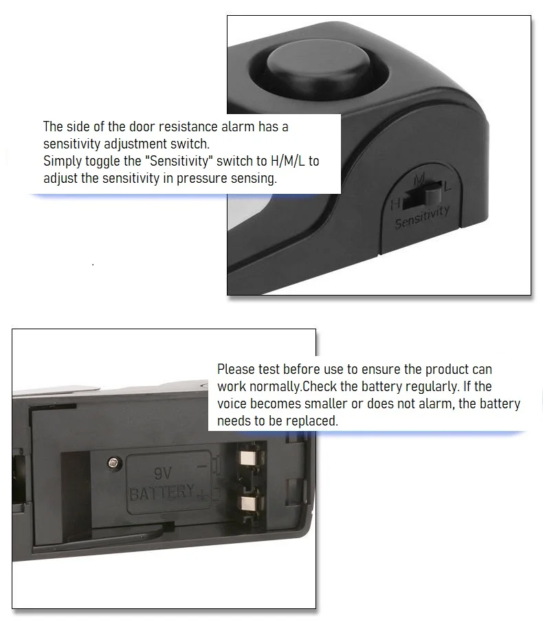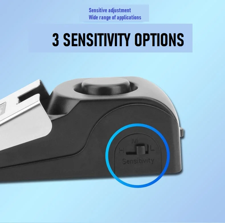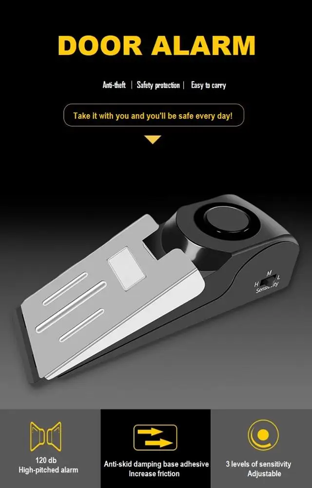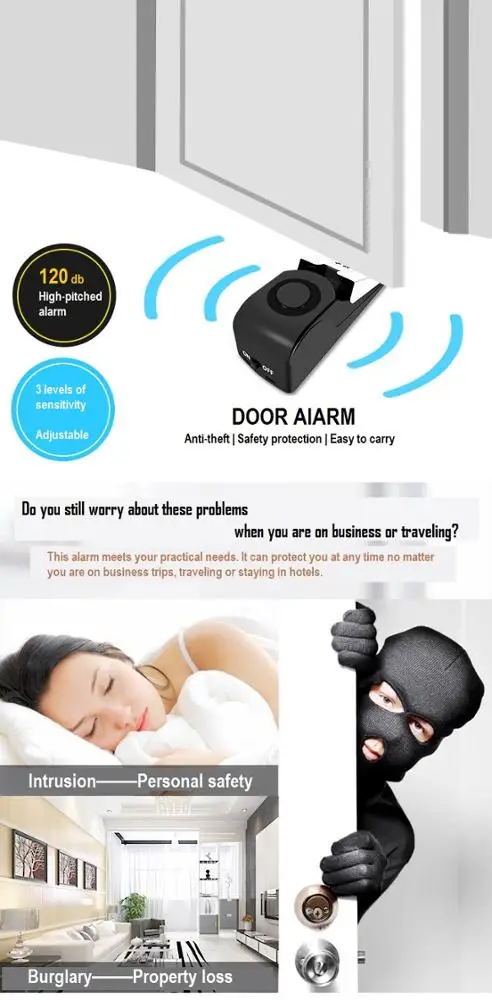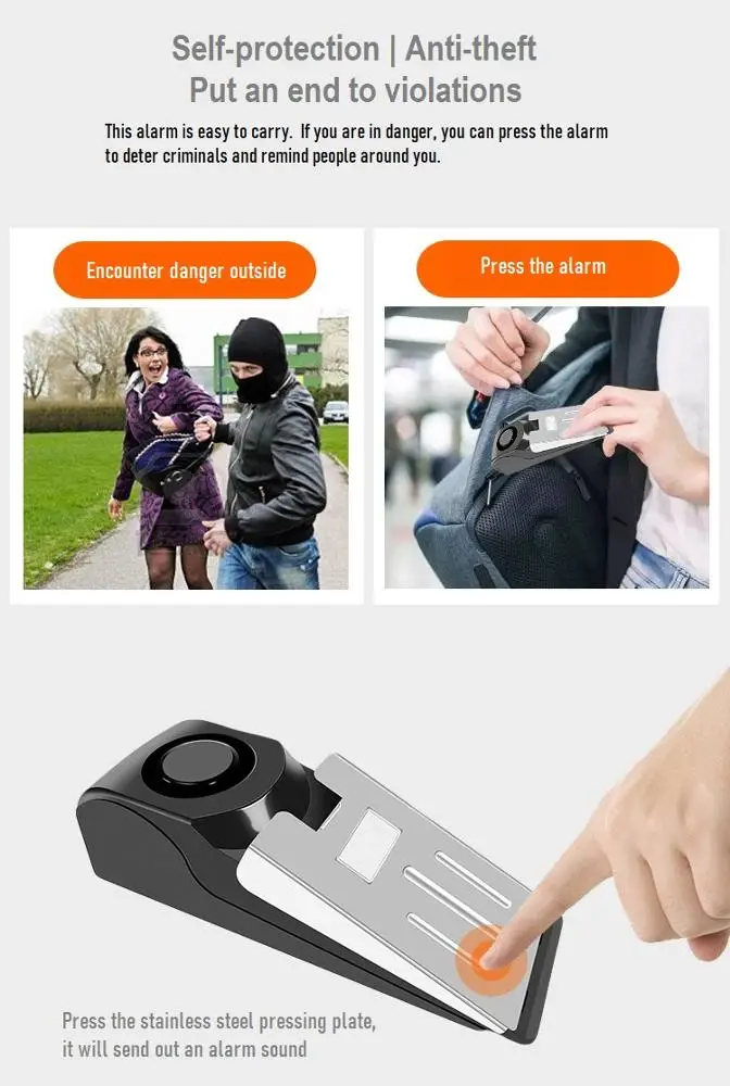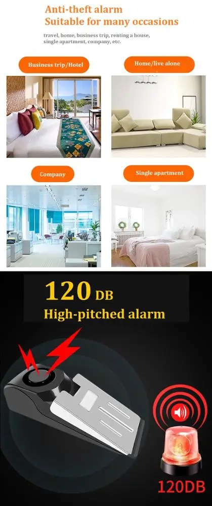 1.Door stopper alarm: place the alarm on the floor behind the door, when somebody push the door, the alarm will emit 125db sound with red flash light, and the door could not be opened.